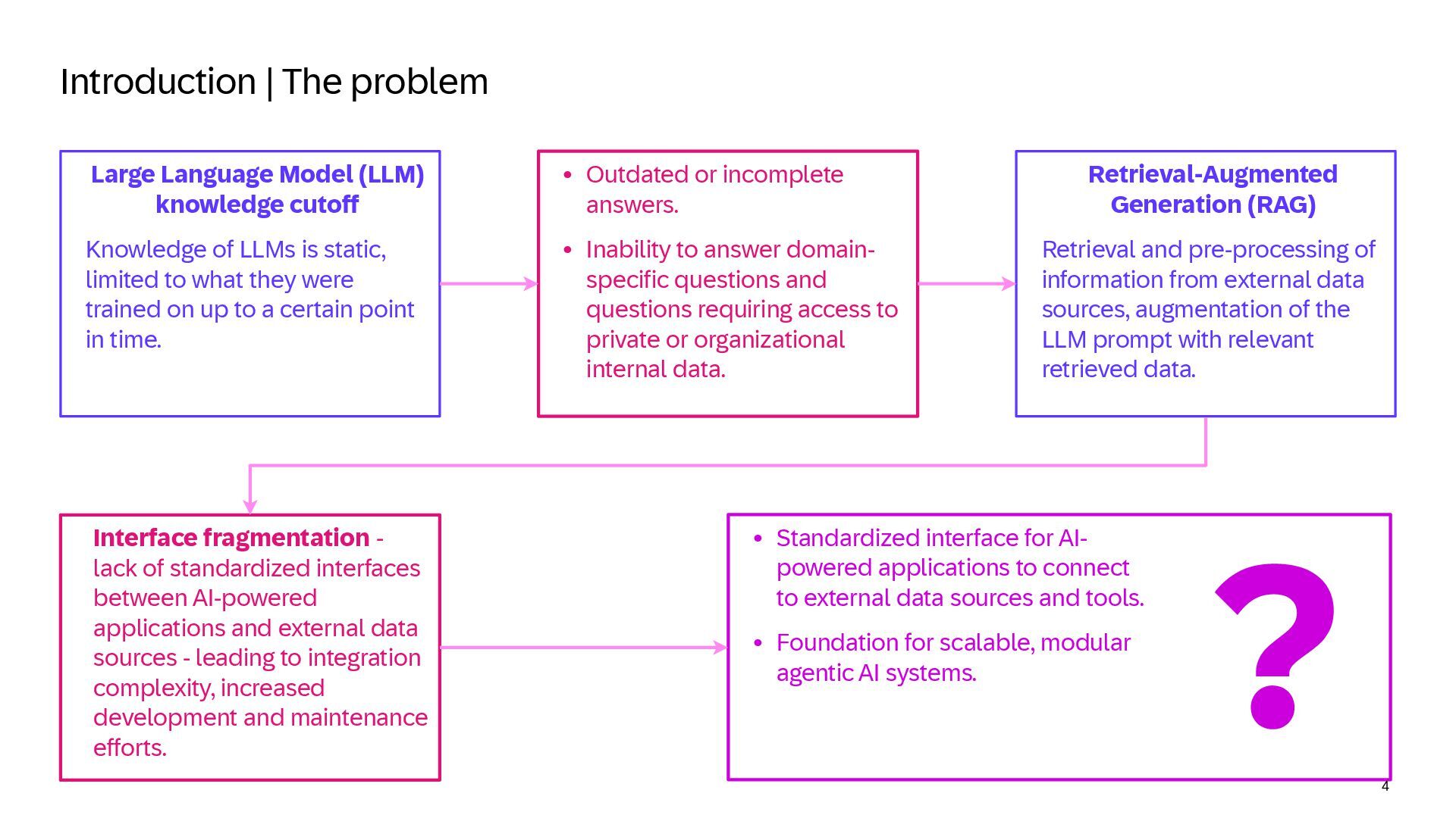 external data sources and tools. • Foundation for scalable, modular agentic AI systems. 4 Introduction | The problem Large Language Model (LLM) knowledge cutoff Knowledge of LLMs is static, limited to what they were trained on up to a certain point in time. Retrieval-Augmented Generation (RAG) Retrieval and pre-processing of information from external data sources, augmentation of the LLM prompt with relevant retrieved data. • Outdated or incomplete answers. • Inability to answer domain- specific questions and questions requiring access to private or organizational internal data. Interface fragmentation - lack of standardized interfaces between AI-powered applications and external data sources - leading to integration complexity, increased development and maintenance efforts. ?