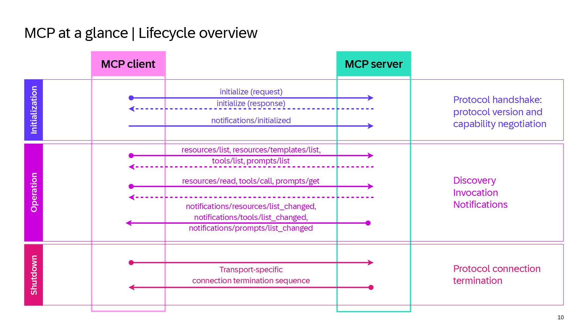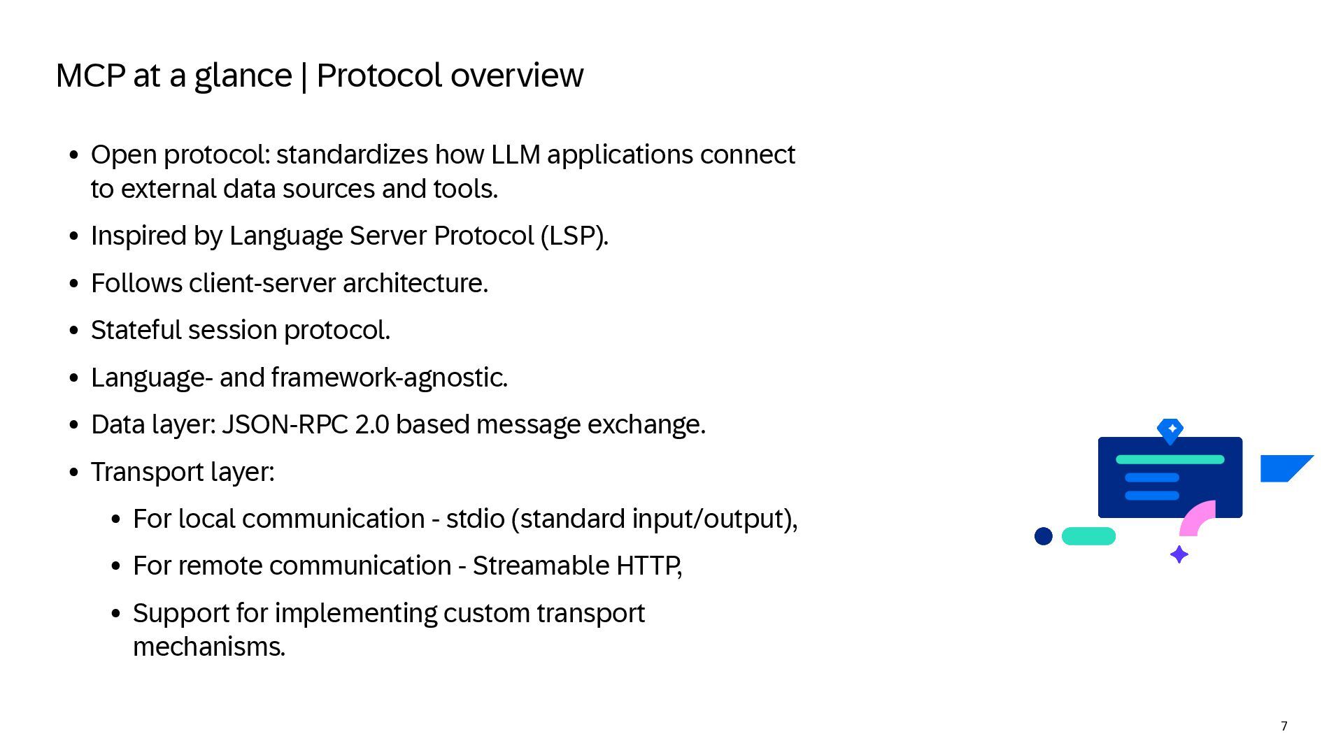 external data sources and tools. • Inspired by Language Server Protocol (LSP). • Follows client-server architecture. • Stateful session protocol. • Language- and framework-agnostic. • Data layer: JSON-RPC 2.0 based message exchange. • Transport layer: • For local communication - stdio (standard input/output), • For remote communication - Streamable HTTP, • Support for implementing custom transport mechanisms. MCP at a glance | Protocol overview