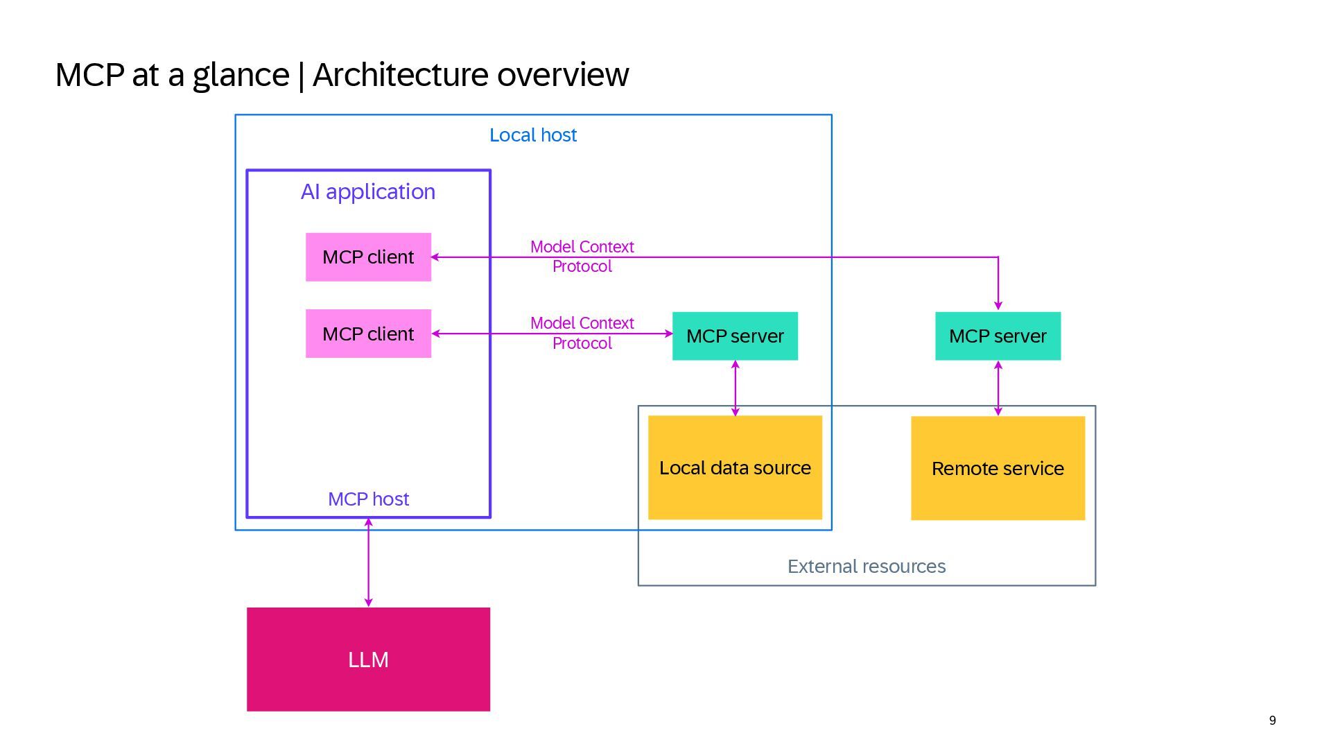 Architecture overview AI application MCP host Local data source LLM Remote service MCP client MCP server MCP client MCP server Model Context Protocol Model Context Protocol