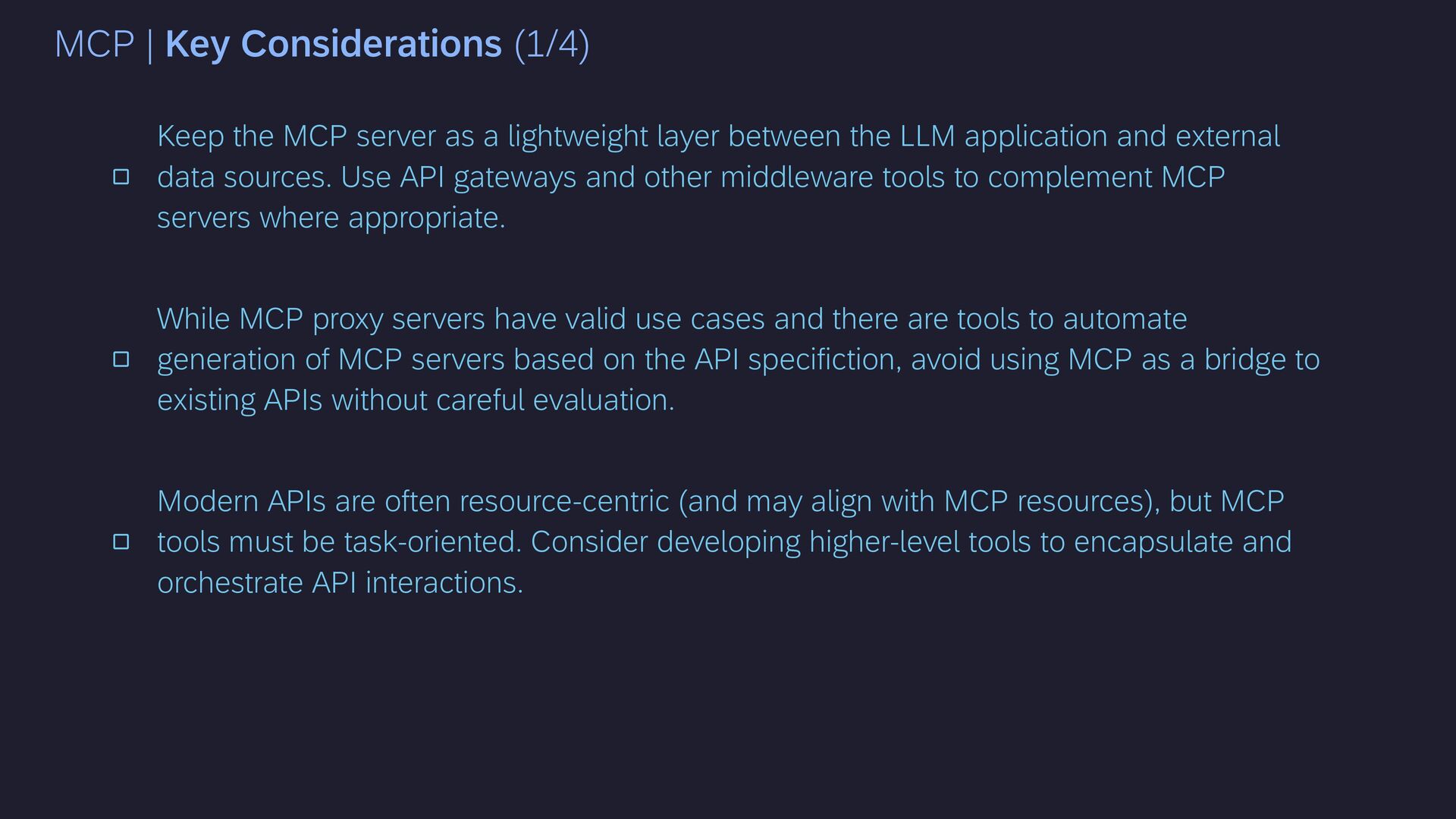valid use cases and there are tools to automate generation of MCP servers based on the API specifiction, avoid using MCP as a bridge to existing APIs without careful evaluation. Keep the MCP server as a lightweight layer between the LLM application and external data sources. Use API gateways and other middleware tools to complement MCP servers where appropriate. Modern APIs are often resource-centric (and may align with MCP resources), but MCP tools must be task-oriented. Consider developing higher-level tools to encapsulate and orchestrate API interactions.