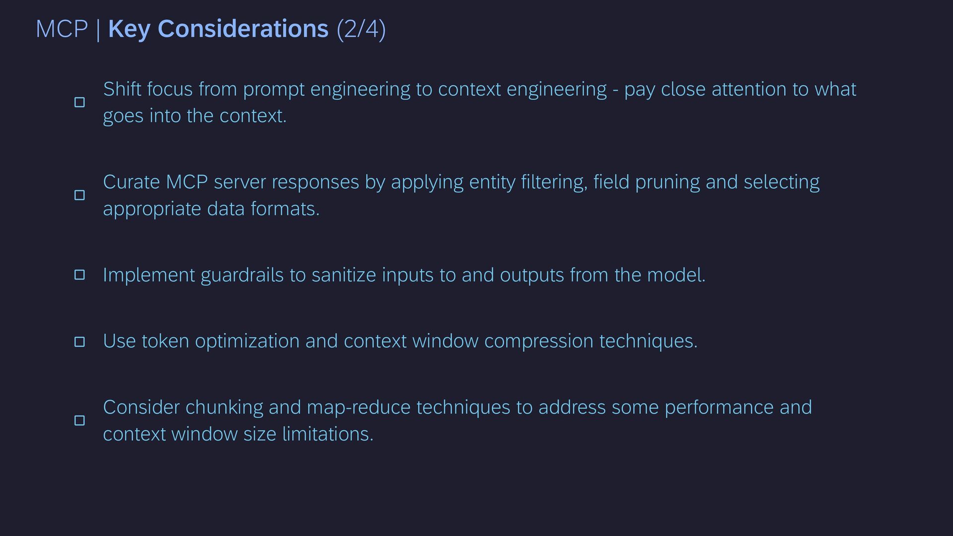 window compression techniques. Shift focus from prompt engineering to context engineering - pay close attention to what goes into the context. Implement guardrails to sanitize inputs to and outputs from the model. Curate MCP server responses by applying entity filtering, field pruning and selecting appropriate data formats. Consider chunking and map-reduce techniques to address some performance and context window size limitations.