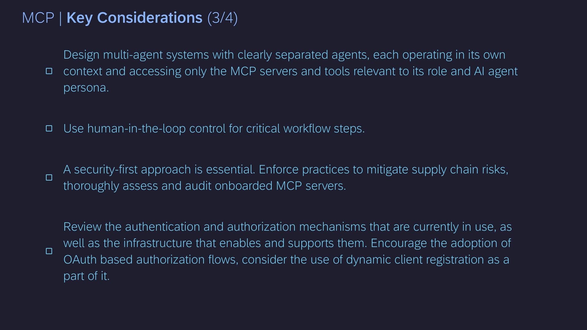 Enforce practices to mitigate supply chain risks, thoroughly assess and audit onboarded MCP servers. Review the authentication and authorization mechanisms that are currently in use, as well as the infrastructure that enables and supports them. Encourage the adoption of OAuth based authorization flows, consider the use of dynamic client registration as a part of it. Use human-in-the-loop control for critical workflow steps. Design multi-agent systems with clearly separated agents, each operating in its own context and accessing only the MCP servers and tools relevant to its role and AI agent persona.