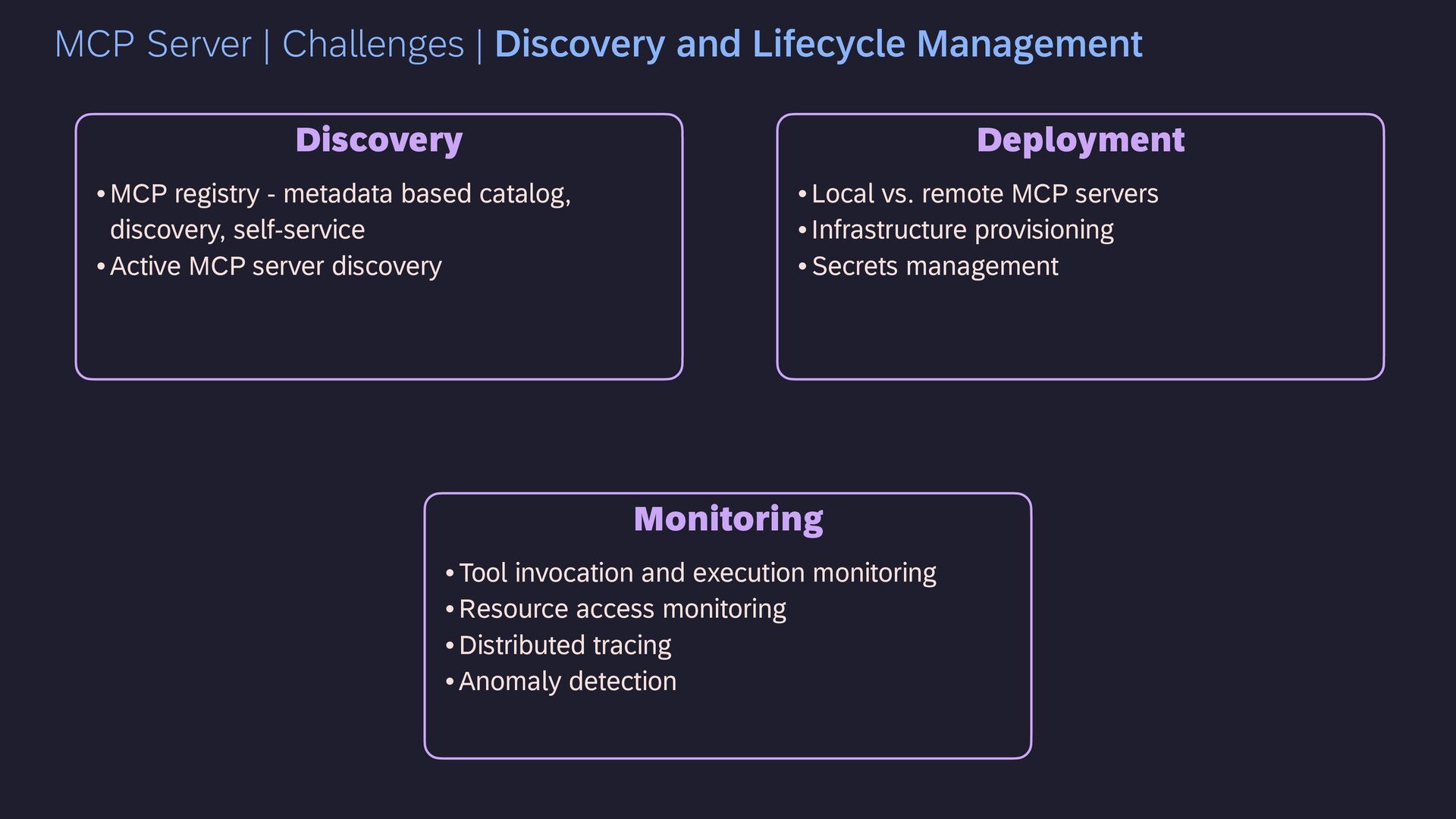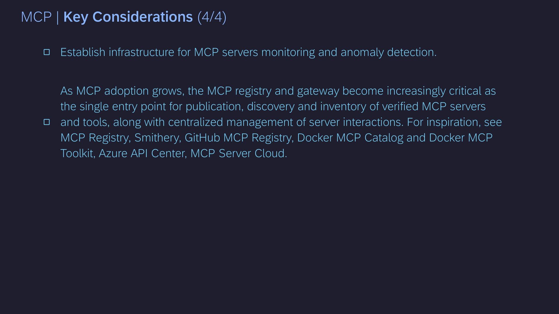 MCP registry and gateway become increasingly critical as the single entry point for publication, discovery and inventory of verified MCP servers and tools, along with centralized management of server interactions. For inspiration, see MCP Registry, Smithery, GitHub MCP Registry, Docker MCP Catalog and Docker MCP Toolkit, Azure API Center, MCP Server Cloud. Establish infrastructure for MCP servers monitoring and anomaly detection.