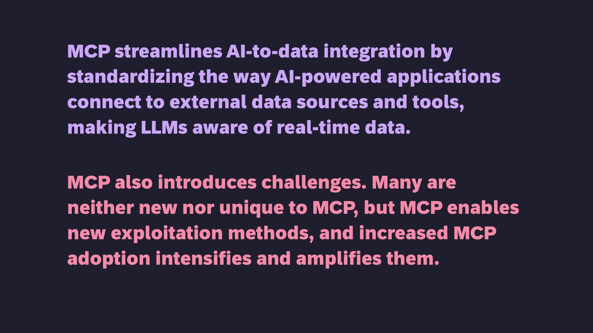 connect to external data sources and tools, making LLMs aware of real-time data. MCP also introduces challenges. Many are neither new nor unique to MCP, but MCP enables new exploitation methods, and increased MCP adoption intensifies and amplifies them.