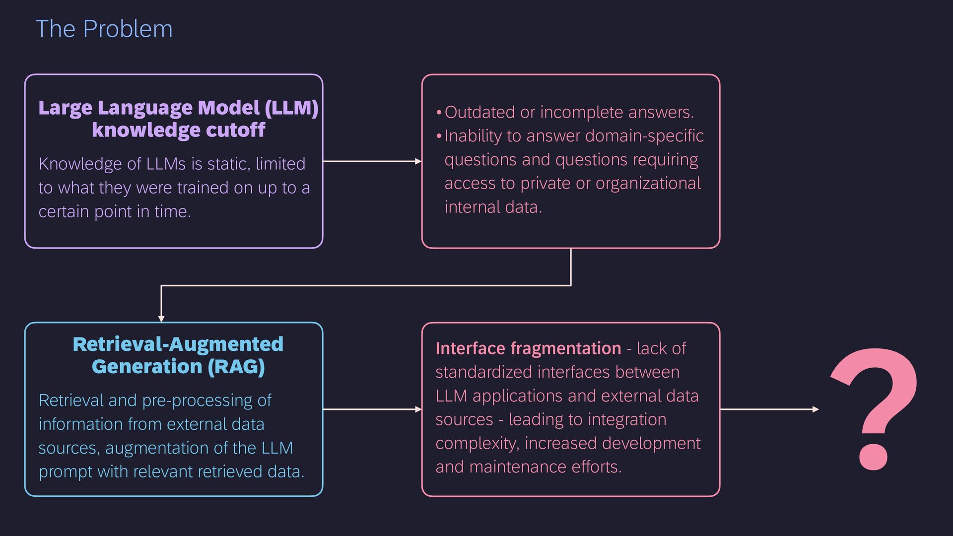 LLMs is static, limited to what they were trained on up to a certain point in time. •Outdated or incomplete answers. •Inability to answer domain-specific questions and questions requiring access to private or organizational internal data. Retrieval-Augmented Generation (RAG) Retrieval and pre-processing of information from external data sources, augmentation of the LLM prompt with relevant retrieved data. Interface fragmentation - lack of standardized interfaces between LLM applications and external data sources - leading to integration complexity, increased development and maintenance efforts. ?