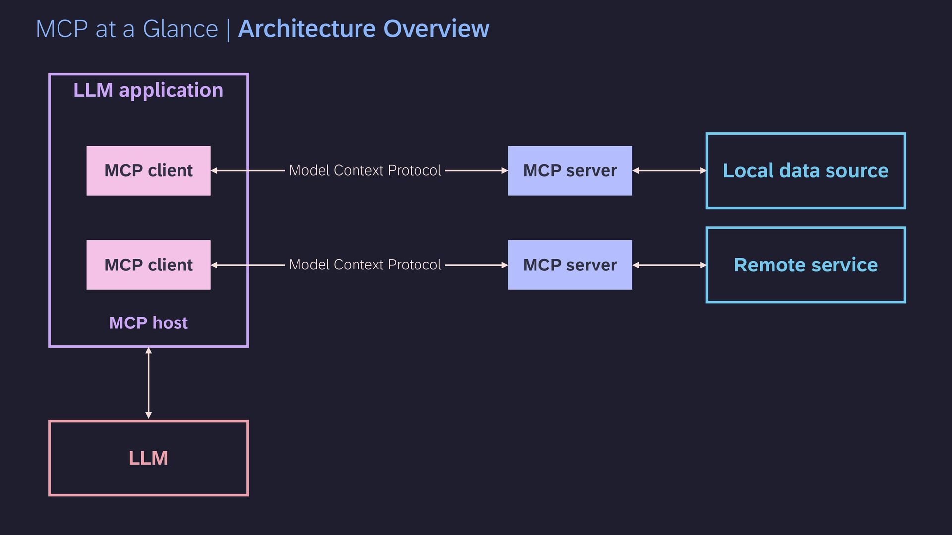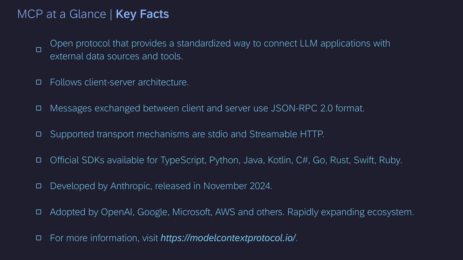 provides a standardized way to connect LLM applications with external data sources and tools. Adopted by OpenAI, Google, Microsoft, AWS and others. Rapidly expanding ecosystem. Official SDKs available for TypeScript, Python, Java, Kotlin, C#, Go, Rust, Swift, Ruby. Messages exchanged between client and server use JSON-RPC 2.0 format. Follows client-server architecture. Supported transport mechanisms are stdio and Streamable HTTP. Developed by Anthropic, released in November 2024. For more information, visit https://modelcontextprotocol.io/.