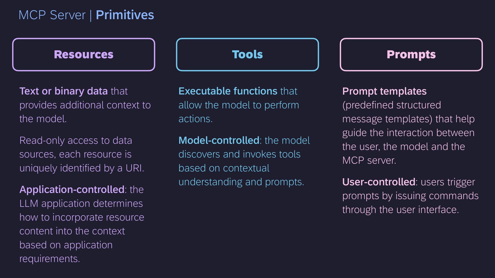 additional context to the model. Read-only access to data sources, each resource is uniquely identified by a URI. Application-controlled: the LLM application determines how to incorporate resource content into the context based on application requirements. Executable functions that allow the model to perform actions. Model-controlled: the model discovers and invokes tools based on contextual understanding and prompts. Prompt templates (predefined structured message templates) that help guide the interaction between the user, the model and the MCP server. User-controlled: users trigger prompts by issuing commands through the user interface. Resources Tools Prompts
