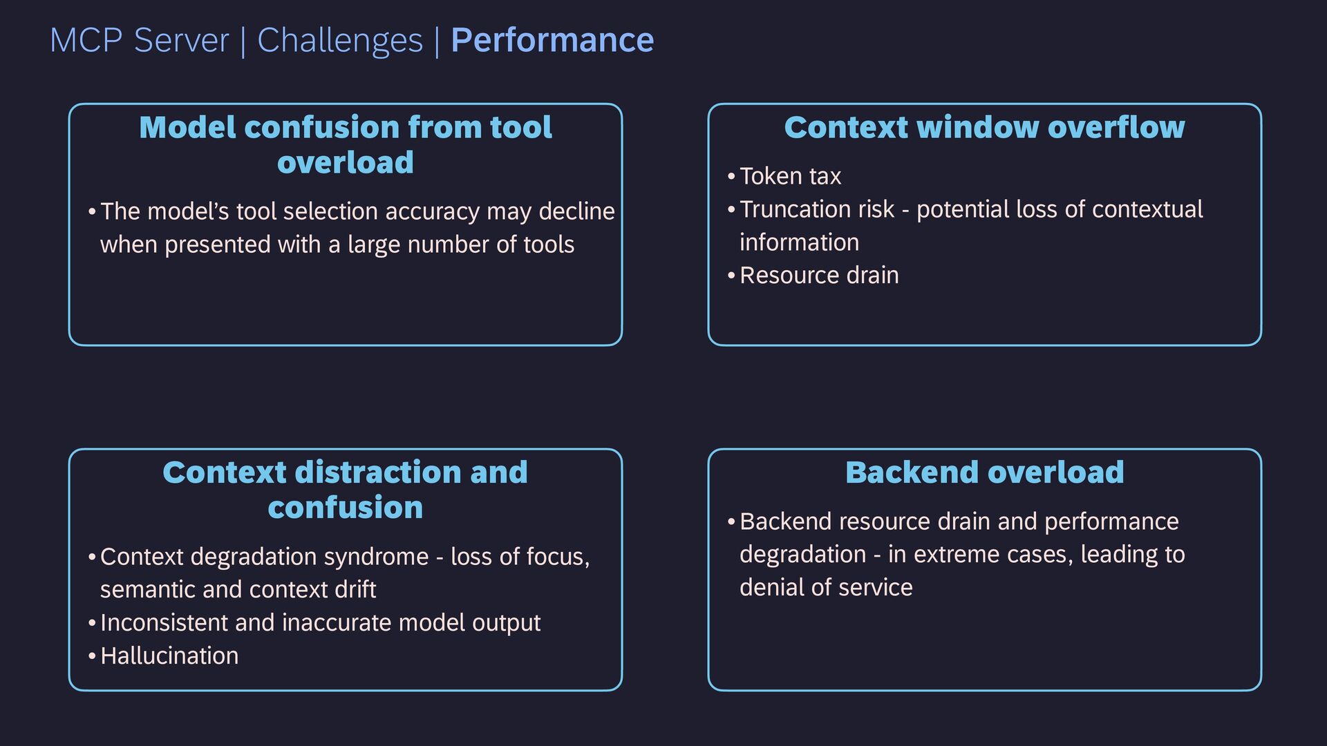 overload • The model’s tool selection accuracy may decline when presented with a large number of tools Context distraction and confusion • Context degradation syndrome - loss of focus, semantic and context drift • Inconsistent and inaccurate model output • Hallucination Context window overflow • Token tax • Truncation risk - potential loss of contextual information • Resource drain Backend overload • Backend resource drain and performance degradation - in extreme cases, leading to denial of service
