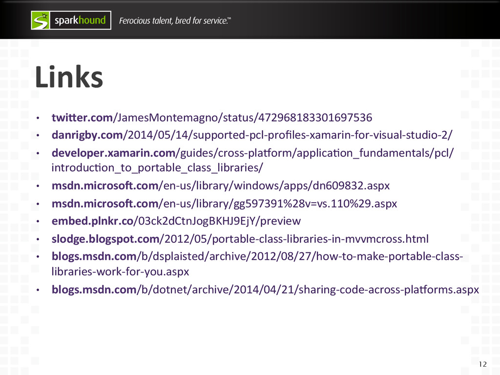 developer.xamarin.com/guides/cross-‐plaVorm/applicaWon_fundamentals/pcl/ introducWon_to_portable_class_libraries/ • msdn.microsoK.com/en-‐us/library/windows/apps/dn609832.aspx • msdn.microsoK.com/en-‐us/library/gg597391%28v=vs.110%29.aspx • embed.plnkr.co/03ck2dCtnJogBKHJ9EjY/preview • slodge.blogspot.com/2012/05/portable-‐class-‐libraries-‐in-‐mvvmcross.html • blogs.msdn.com/b/dsplaisted/archive/2012/08/27/how-‐to-‐make-‐portable-‐class-‐ libraries-‐work-‐for-‐you.aspx • blogs.msdn.com/b/dotnet/archive/2014/04/21/sharing-‐code-‐across-‐plaVorms.aspx 12