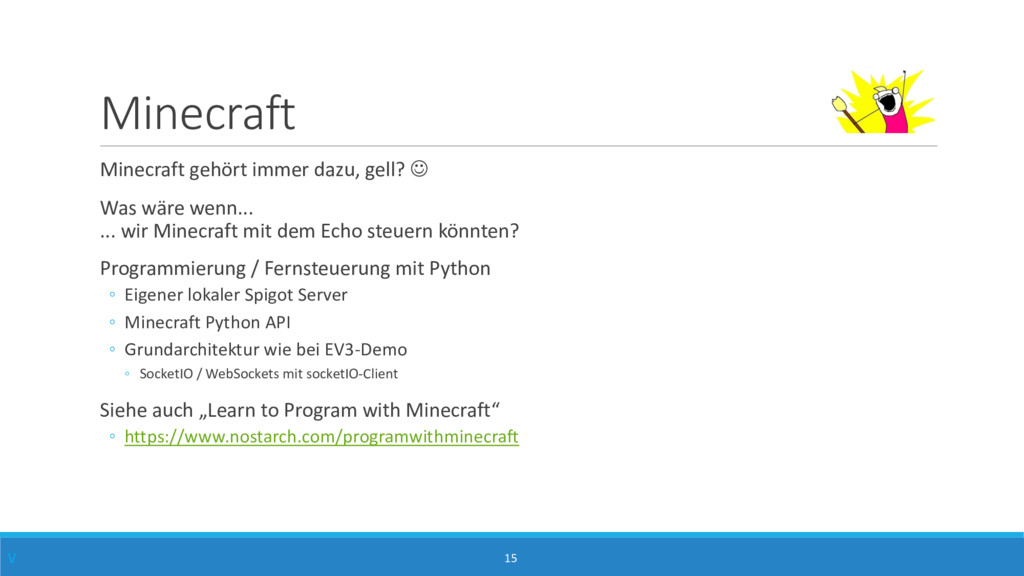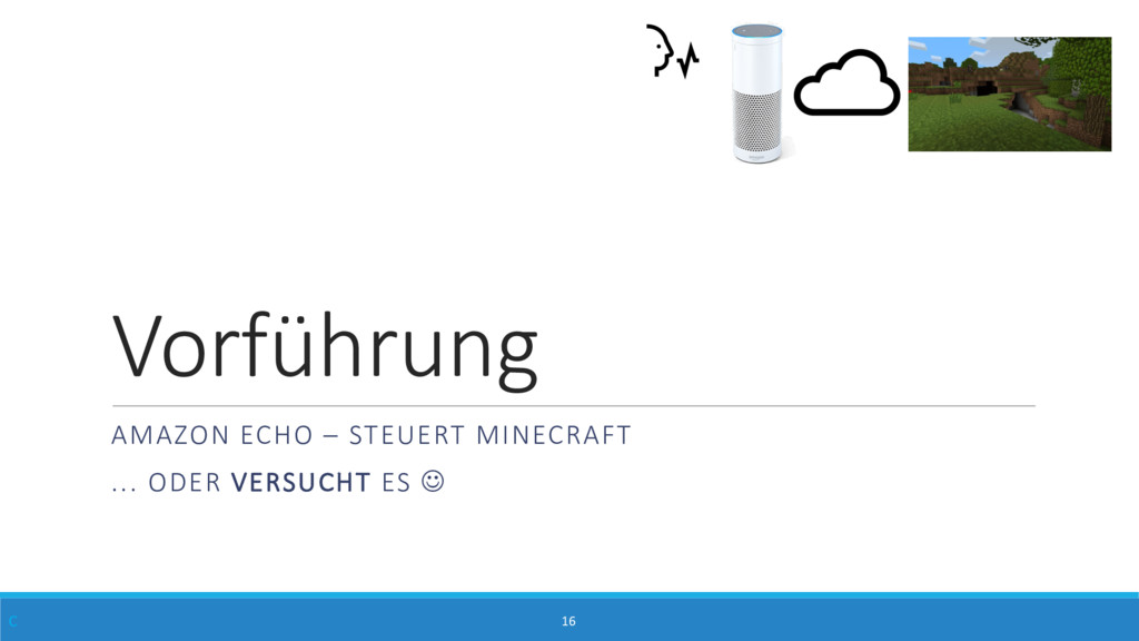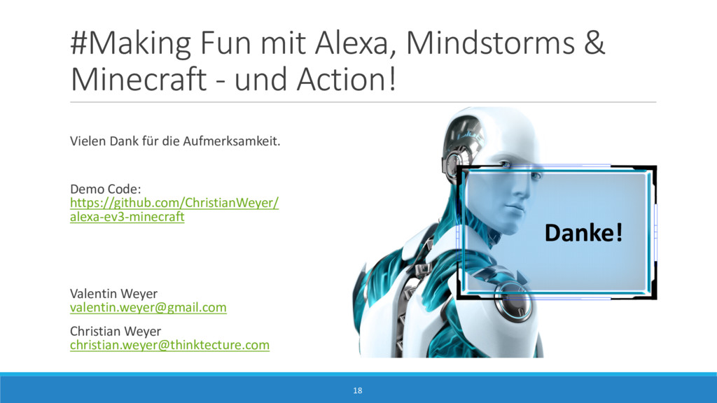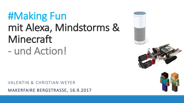 Wie cool wäre es, wenn man bspw. einen selbst gebauten LEGO Mindstorms EV3 Roboter über Alexa fernsteuert? Oder wenn man mit seiner eigenen Stimme die geliebte Minecraft-Welt kontrollieren könnte? Kommt vorbei und seht all dies in Action.