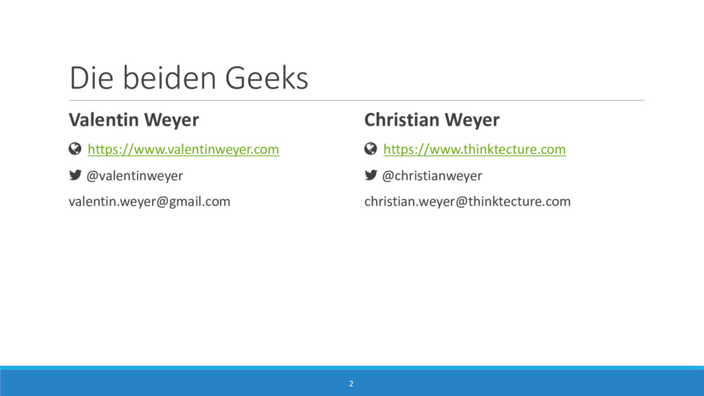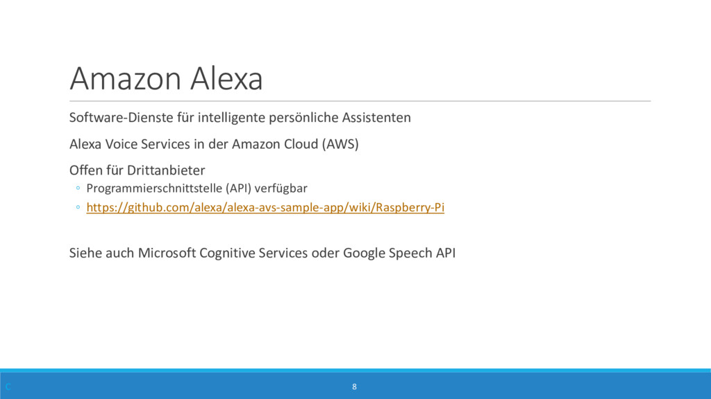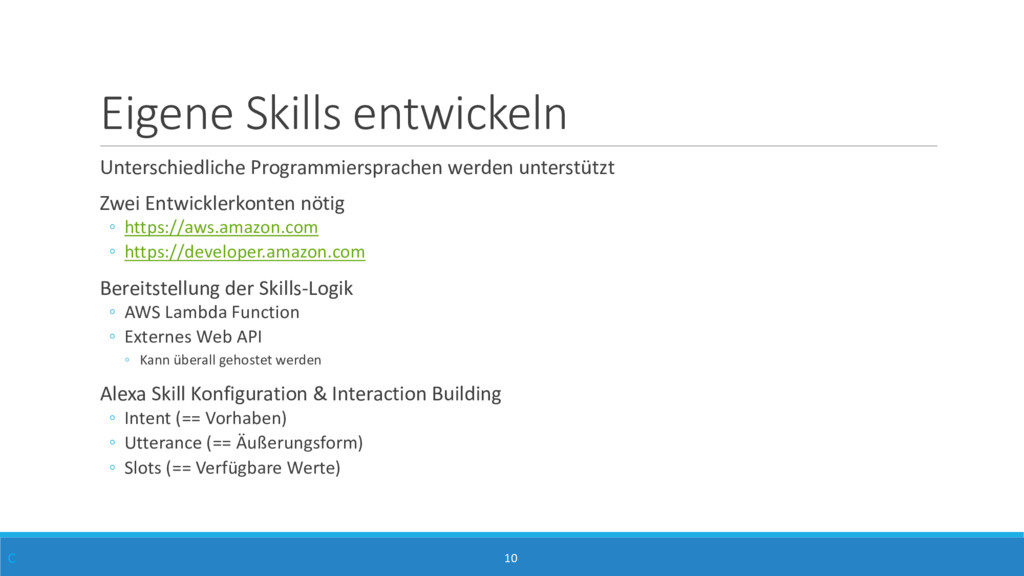 Sprachsteuerung in den eigenen vier Wänden verbreitet sich immer mehr. Ob es Amazon Echo, Google Home oder Apple HomePod ist: wir reden mit diesen Geräten, um Nachrichten zu erfahren oder um Dinge zu steuern. In diesem Vortrag wollen Valentin & Christian zeigen, wie man eigene Devices und Umgebungen mit Amazon Echos Alexa Cloud-Dienst verbinden und anprogrammieren kann.