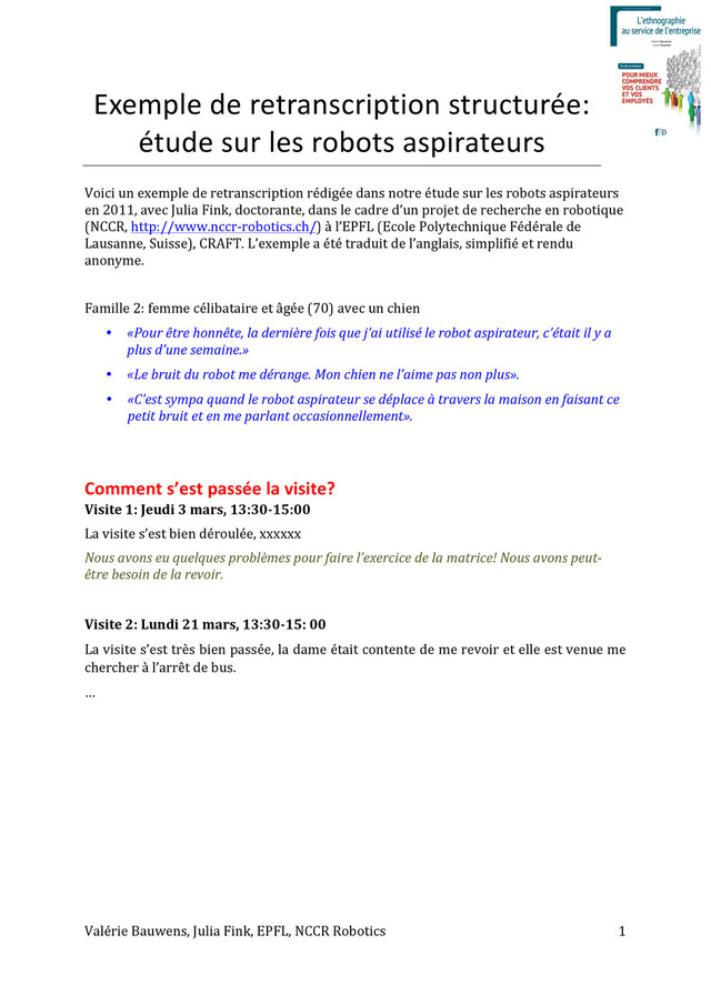 3) Habitudes de nettoyages, concrètement Pendant deux semaines, la femme de ménage est présente, elle affirme passer l’aspirateur au moins une fois par semaine, mais uniquement dans le salon. Elle déclare plutôt faire la poussière et balayer dans la cuisine, par exemple. «Pour être honnête, la dernière fois que j’ai utilisé mon aspirateur, c’était il y a plus d’une semaine...» Résultats de l’exercice sur son emploi du temps Elle affirme n’être pas sûre des activités qu’elle devrait inscrire dans son emploi du temps d’hier. Elle fut un peu surprise de se rendre compte du fait qu’elle nettoie habituellement un petit peu plusieurs fois par jour. En général, pendant une semaine, il y a plusieurs courtes activités ponctuelles de nettoyage (jusqu’à 10 minutes) étendues sur toute la journée: 10h30, 13h, 14h, 16h, 17h30, 20h, 23h • balayer le sol dans le hall d’entrée, le salon, la cuisine • ramasser les poils du chien sur les sols et les canapés (parfois avec des pincettes) • lessive • vaisselle, lave-‐vaisselle • nettoyer la table ... 4) Problèmes de nettoyage aujourd’hui? Il est évident qu’elle a des difficultés à mettre de l’ordre et à jeter des choses à la poubelle quand elles ne sont plus nécessaires (par ex. une douzaine de verres vides, des sacs vides dans la cave, des piles de vieux journaux). Elle semble plutôt tout mettre dans la cave. Les problèmes de nettoyages sont liés à: • La découverte de la saleté [poils de chien] • Le retour à la maison • La fin de la journée [avant d’aller dormir] • La préparation des repas • Des invités Aujourd’hui, les endroits difficiles à nettoyer dans la maison sont: • Au rez de chaussée: o Cuisine o Salle à manger o Salon