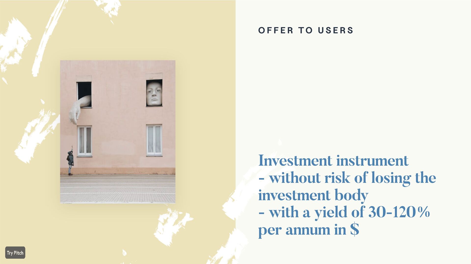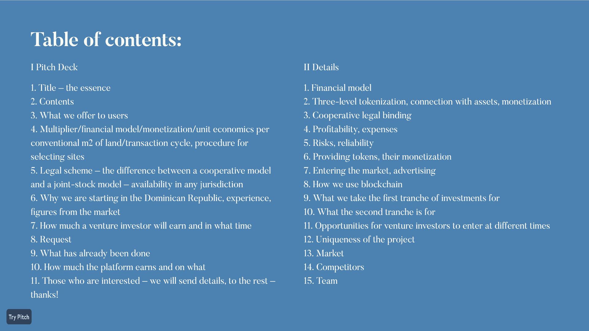 3. Cooperative legal binding 4. Profitability, expenses 5. Risks, reliability 6. Providing tokens, their monetization 7. Entering the market, advertising 8. How we use blockchain 9. What we take the first tranche of investments for 10. What the second tranche is for 11. Opportunities for venture investors to enter at different times 12. Uniqueness of the project 13. Market 14. Competitors 15. Team II Details 1. Title – the essence 2. Contents 3. What we offer to users 4. Multiplier/financial model/monetization/unit economics per conventional m2 of land/transaction cycle, procedure for selecting sites 5. Legal scheme – the difference between a cooperative model and a joint-stock model – availability in any jurisdiction 6. Why we are starting in the Dominican Republic, experience, figures from the market 7. How much a venture investor will earn and in what time 8. Request 9. What has already been done 10. How much the platform earns and on what 11. Those who are interested – we will send details, to the rest – thanks! I Pitch Deck Table of contents: