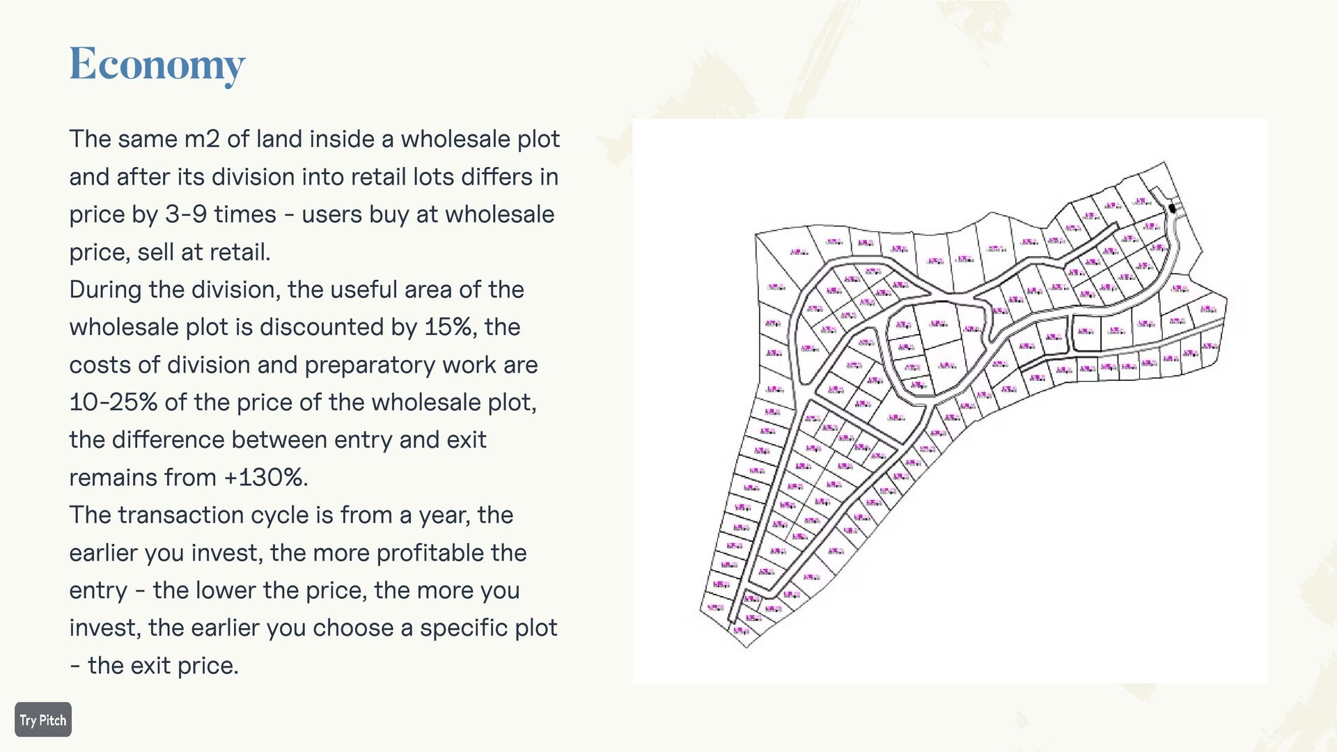 and after its division into retail lots differs in price by 3-9 times - users buy at wholesale price, sell at retail. During the division, the useful area of the wholesale plot is discounted by 15%, the costs of division and preparatory work are 10-25% of the price of the wholesale plot, the difference between entry and exit remains from +130%. The transaction cycle is from a year, the earlier you invest, the more profitable the entry - the lower the price, the more you invest, the earlier you choose a specific plot - the exit price. 0 50 100 150 200 First value Second value Third value Fourth value Fifth value Sixth value Seventh value First value Label Label