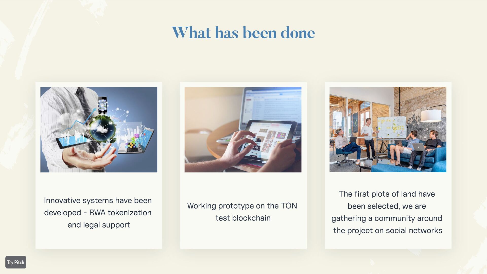 support Working prototype on the TON test blockchain The first plots of land have been selected, we are gathering a community around the project on social networks What has been done
