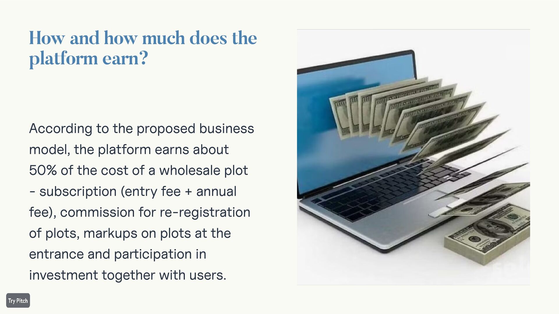 the proposed business model, the platform earns about 50% of the cost of a wholesale plot - subscription (entry fee + annual fee), commission for re-registration of plots, markups on plots at the entrance and participation in investment together with users.