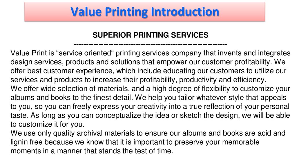 “service oriented“ printing services company that invents and integrates design services, products and solutions that empower our customer profitability. We offer best customer experience, which include educating our customers to utilize our services and products to increase their profitability, productivity and efficiency. We offer wide selection of materials, and a high degree of flexibility to customize your albums and books to the finest detail. We help you tailor whatever style that appeals to you, so you can freely express your creativity into a true reflection of your personal taste. As long as you can conceptualize the idea or sketch the design, we will be able to customize it for you. We use only quality archival materials to ensure our albums and books are acid and lignin free because we know that it is important to preserve your memorable moments in a manner that stands the test of time.