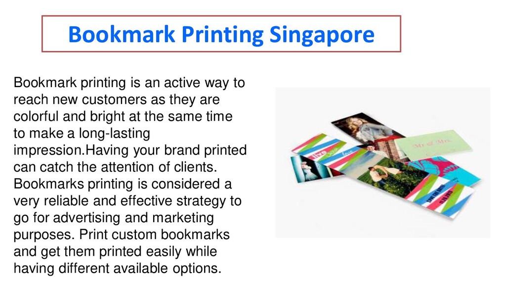 as they are colorful and bright at the same time to make a long-lasting impression.Having your brand printed can catch the attention of clients. Bookmarks printing is considered a very reliable and effective strategy to go for advertising and marketing purposes. Print custom bookmarks and get them printed easily while having different available options. Bookmark Printing Singapore