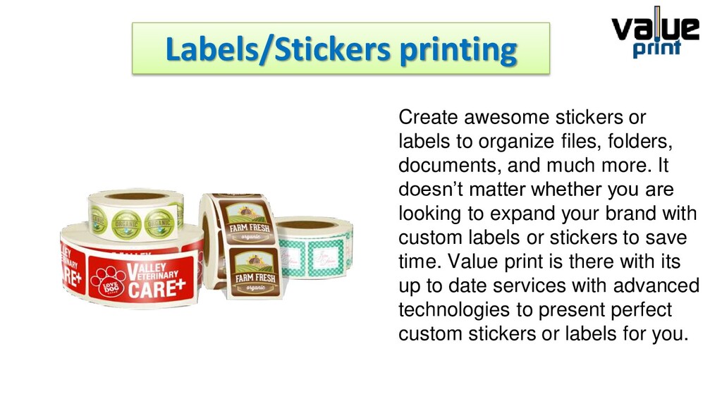 and much more. It doesn’t matter whether you are looking to expand your brand with custom labels or stickers to save time. Value print is there with its up to date services with advanced technologies to present perfect custom stickers or labels for you. Labels/Stickers printing