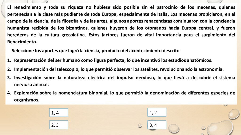 sin el patrocinio de los mecenas, quienes pertenecían a la clase más pudiente de toda Europa, especialmente de Italia. Los mecenas propiciaron, en el campo de la ciencia, de la filosofía y de las artes, algunos aportes renacentistas continuaron con la conciencia humanista recibida de los bizantinos, quienes huyeron de los otomanos hacia Europa central, y fueron herederos de la cultura grecolatina. Estos factores fueron de vital importancia para el surgimiento del Renacimiento. Seleccione los aportes que logró la ciencia, producto del acontecimiento descrito 1. Representación del ser humano como figura perfecta, lo que incentivó los estudios anatómicos. 2. Implementación del telescopio, lo que permitió observar los satélites, revolucionando la astronomía. 3. Investigación sobre la naturaleza eléctrica del impulso nervioso, lo que llevó a descubrir el sistema nervioso animal. 4. Exploración sobre la nomenclatura binomial, lo que permitió la denominación de diferentes especies de organismos. 1, 4 2, 3 3, 4 1, 2