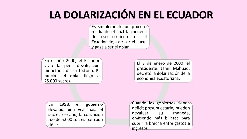 el cual la moneda de uso corriente en el Ecuador deja de ser el sucre y pasa a ser el dólar. El 9 de enero de 2000, el presidente, Jamil Mahuad, decretó la dolarización de la economía ecuatoriana. Cuando los gobiernos tienen déficit presupuestario, pueden devaluar su moneda, emitiendo más billetes para cubrir la brecha entre gastos e ingresos En 1998, el gobierno devaluó, una vez más, el sucre. Ese año, la cotización fue de 5.000 sucres por cada dólar En el año 2000, el Ecuador vivió la peor devaluación monetaria de su historia. El precio del dólar llegó a 25.000 sucres.