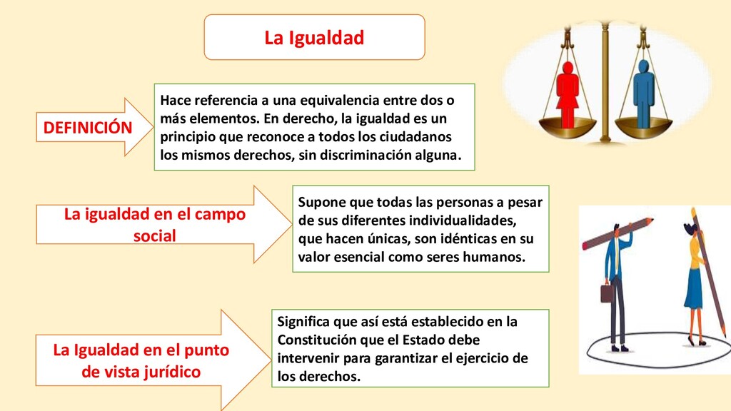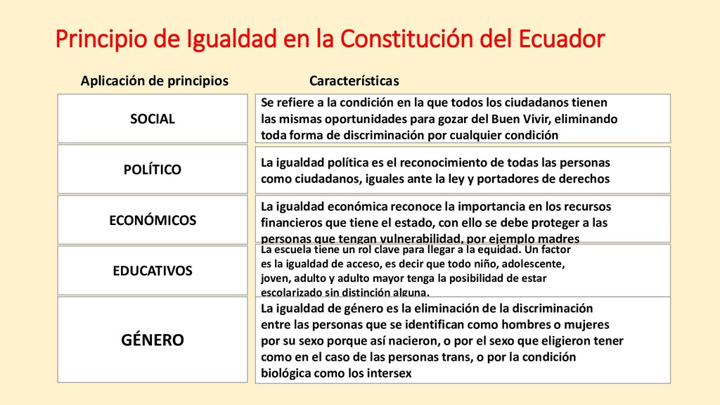 principios Características SOCIAL POLÍTICO ECONÓMICOS EDUCATIVOS GÉNERO Se refiere a la condición en la que todos los ciudadanos tienen las mismas oportunidades para gozar del Buen Vivir, eliminando toda forma de discriminación por cualquier condición La igualdad política es el reconocimiento de todas las personas como ciudadanos, iguales ante la ley y portadores de derechos La igualdad económica reconoce la importancia en los recursos financieros que tiene el estado, con ello se debe proteger a las personas que tengan vulnerabilidad, por ejemplo madres solteras, personas de 3era edad, personas con capacidades especiales, entre otros La escuela tiene un rol clave para llegar a la equidad. Un factor es la igualdad de acceso, es decir que todo niño, adolescente, joven, adulto y adulto mayor tenga la posibilidad de estar escolarizado sin distinción alguna. La igualdad de género es la eliminación de la discriminación entre las personas que se identifican como hombres o mujeres por su sexo porque así nacieron, o por el sexo que eligieron tener como en el caso de las personas trans, o por la condición biológica como los intersex