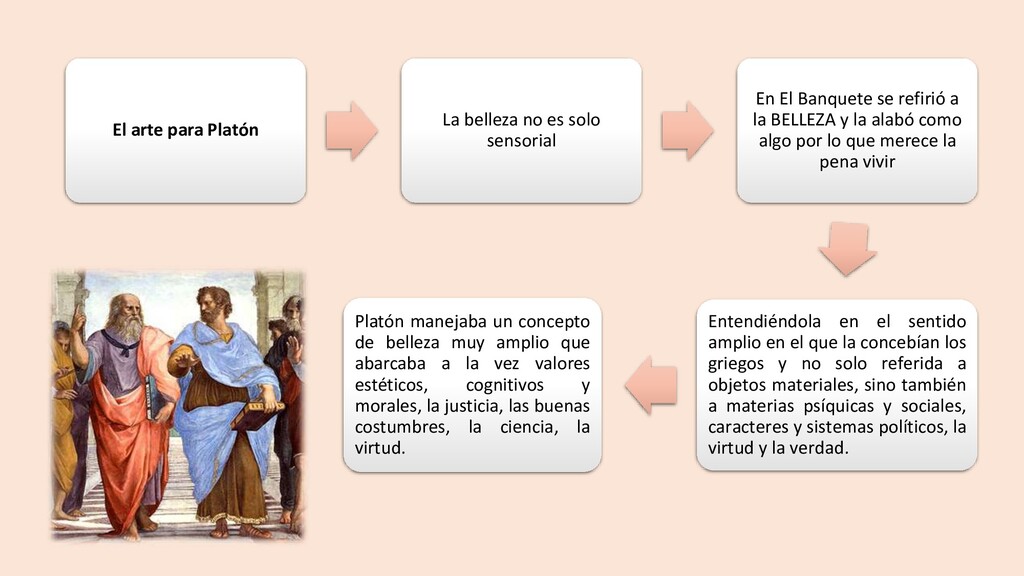 En El Banquete se refirió a la BELLEZA y la alabó como algo por lo que merece la pena vivir Entendiéndola en el sentido amplio en el que la concebían los griegos y no solo referida a objetos materiales, sino también a materias psíquicas y sociales, caracteres y sistemas políticos, la virtud y la verdad. Platón manejaba un concepto de belleza muy amplio que abarcaba a la vez valores estéticos, cognitivos y morales, la justicia, las buenas costumbres, la ciencia, la virtud.