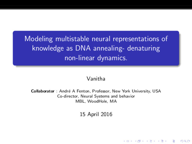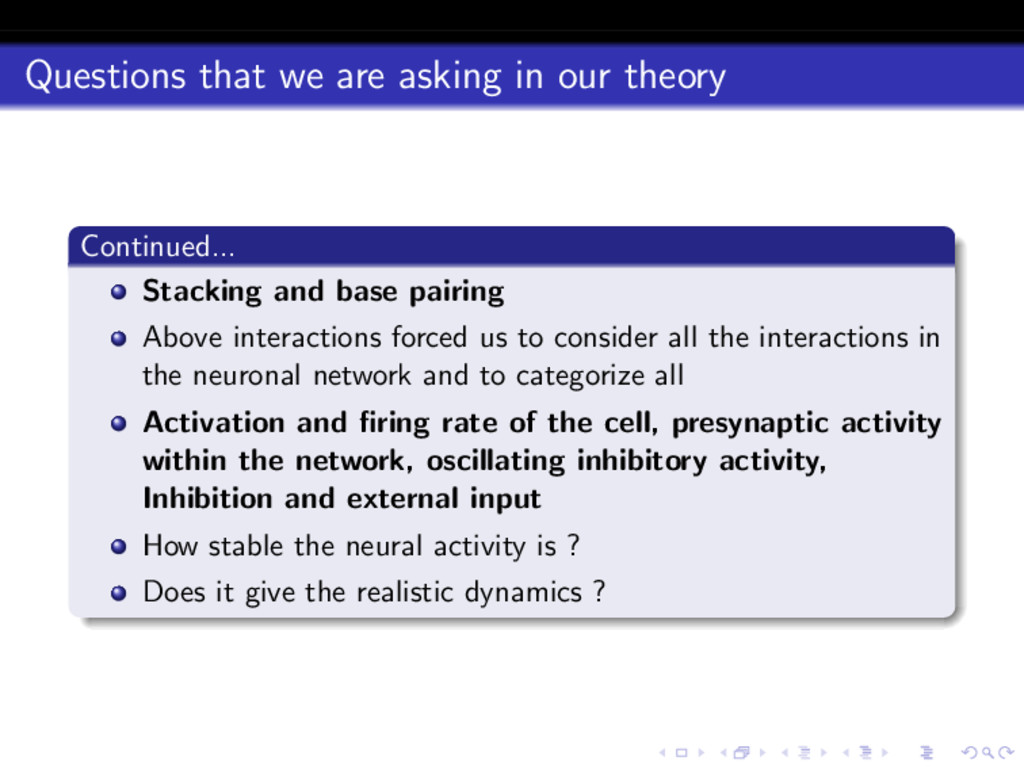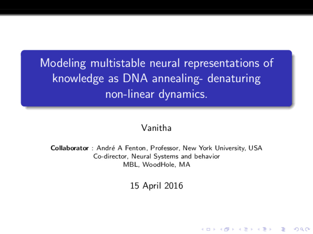 The objective of the proposed work is to characterize and explain the multistable patterns of discharge using the well-developed non-linear dynamical framework that I have used to explain DNA annealing-denaturing during my doctoral work. This theoretical framework will be used to identify critical variables that control the neural dynamics, such as the possibility that temperature in that case of DNA is analogous to either overall neural