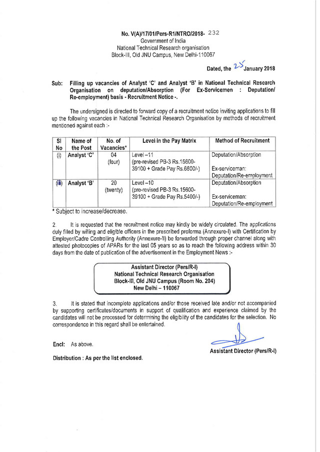 Filling up vacancies of Analyst 'C' and Analyst 'B' in National Technical Research Organisation on deputation/Absorption (For Ex-Servicemen: Deputation/ Re-employment) basis - latest Govt jobs updates Recruitment Notice -. you can also get all latest Govt jobs club updates at govtjobsclub