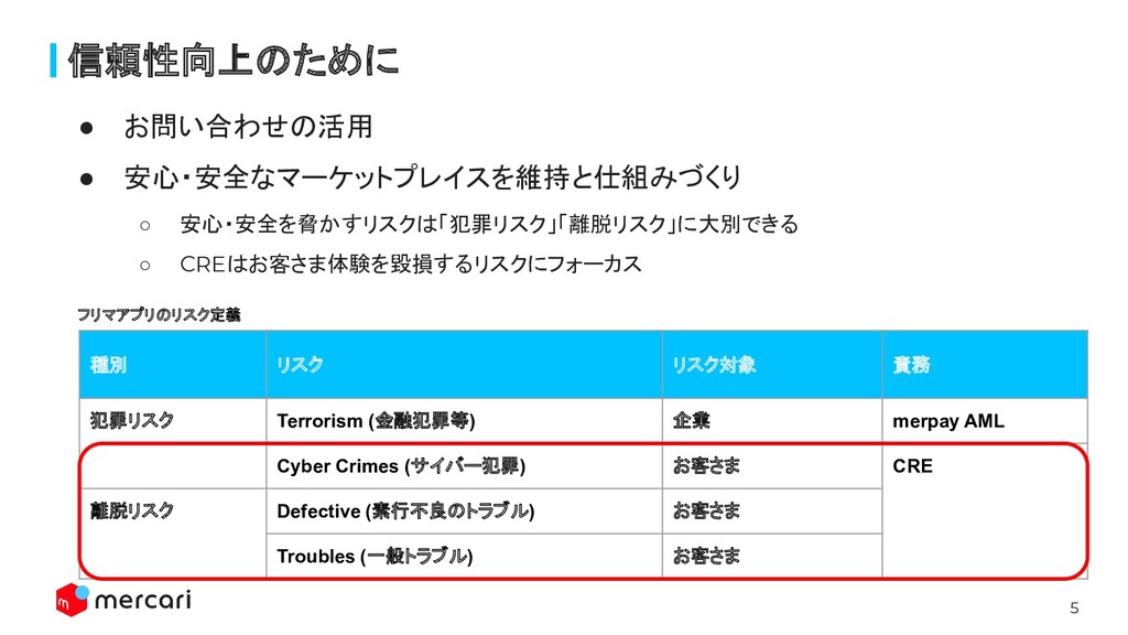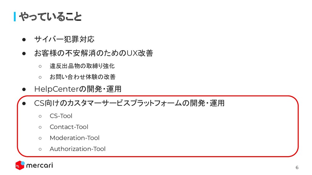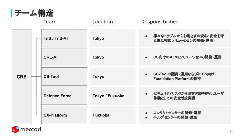 Force CX-Platform • 様々なトラブルからお客さまの安心・安全を守 る違反検知ソリューションの開発・運用 • CS-Toolの開発・運用ならびに CS向け Foundation Platformの維持 • セキュリティリスクからお客さまを守り、ユーザ 体験としての安全性を実現 • コンタクトセンターの開発・運用 • ヘルプセンターの開発・運用 Location Tokyo Tokyo Tokyo / Fukuoka Fukuoka CRE-AI • CS向けのAI/MLソリューションの開発・運用 Tokyo