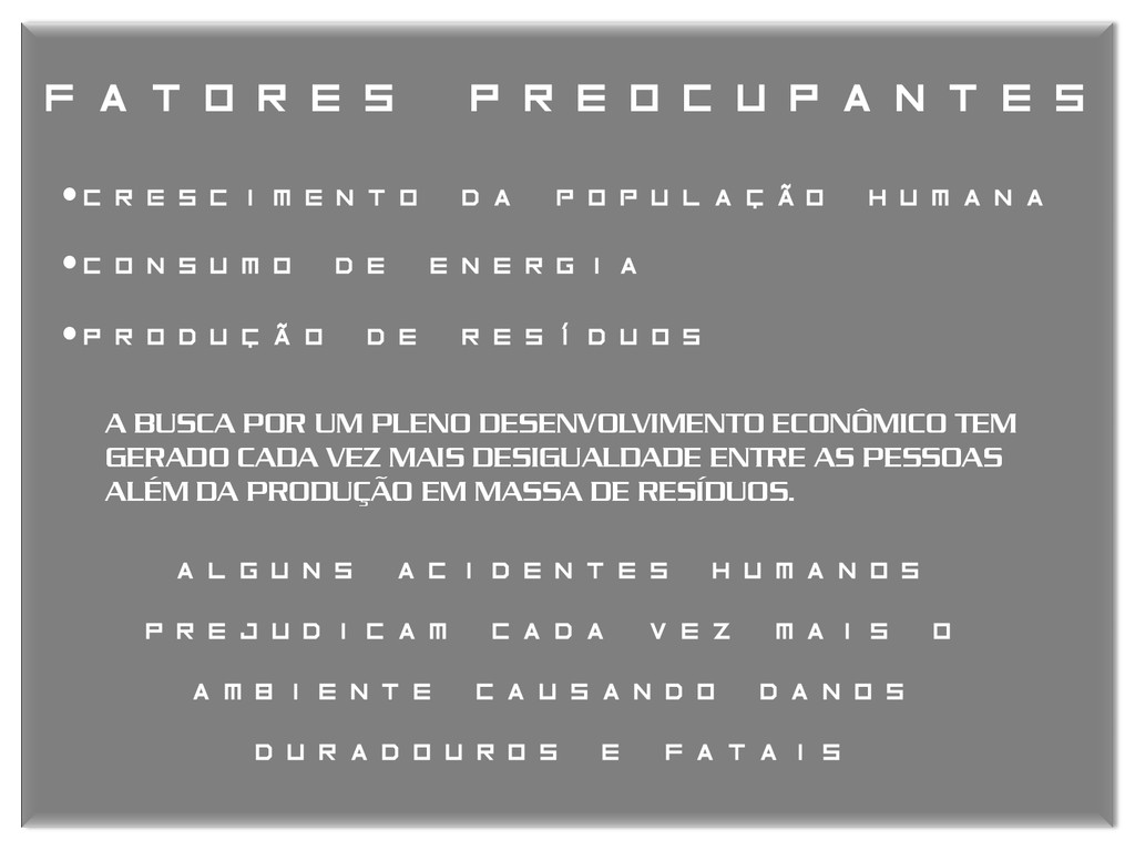 população humana A BUSCA POR UM PLENO DESENVOLVIMENTO ECONÔMICO TEM GERADO CADA VEZ MAIS DESIGUALDADE ENTRE AS PESSOAS ALÉM DA PRODUÇÃO EM MASSA DE RESÍDUOS. ALGUNS ACIDENTES HUMANOS PREJUDICAM CADA VEZ MAIS O AMBIENTE CAUSANDO DANOS DURADOUROS E FATAIS