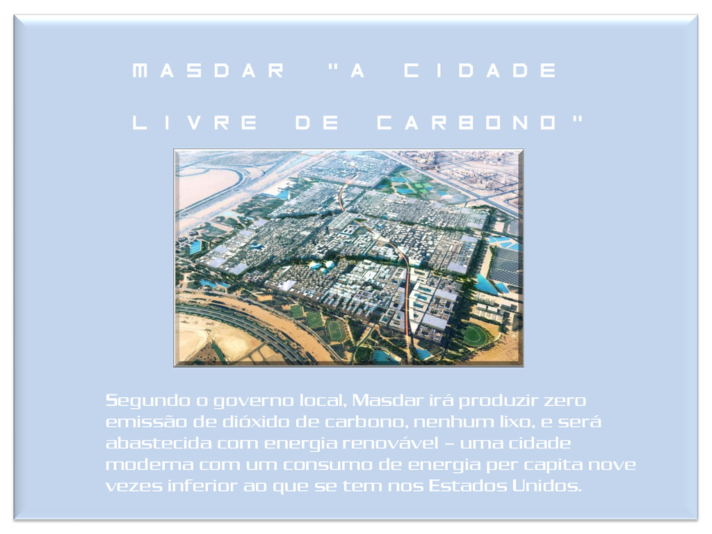Masdar irá produzir zero emissão de dióxido de carbono, nenhum lixo, e será abastecida com energia renovável – uma cidade moderna com um consumo de energia per capita nove vezes inferior ao que se tem nos Estados Unidos.