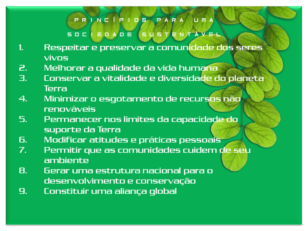 Melhorar a qualidade da vida humana 3. Conservar a vitalidade e diversidade do planeta Terra 4. Minimizar o esgotamento de recursos não renováveis 5. Permanecer nos limites da capacidade do suporte da Terra 6. Modificar atitudes e práticas pessoais 7. Permitir que as comunidades cuidem de seu ambiente 8. Gerar uma estrutura nacional para o desenvolvimento e conservação 9. Constituir uma aliança global Princípios para uma sociedade sustentável