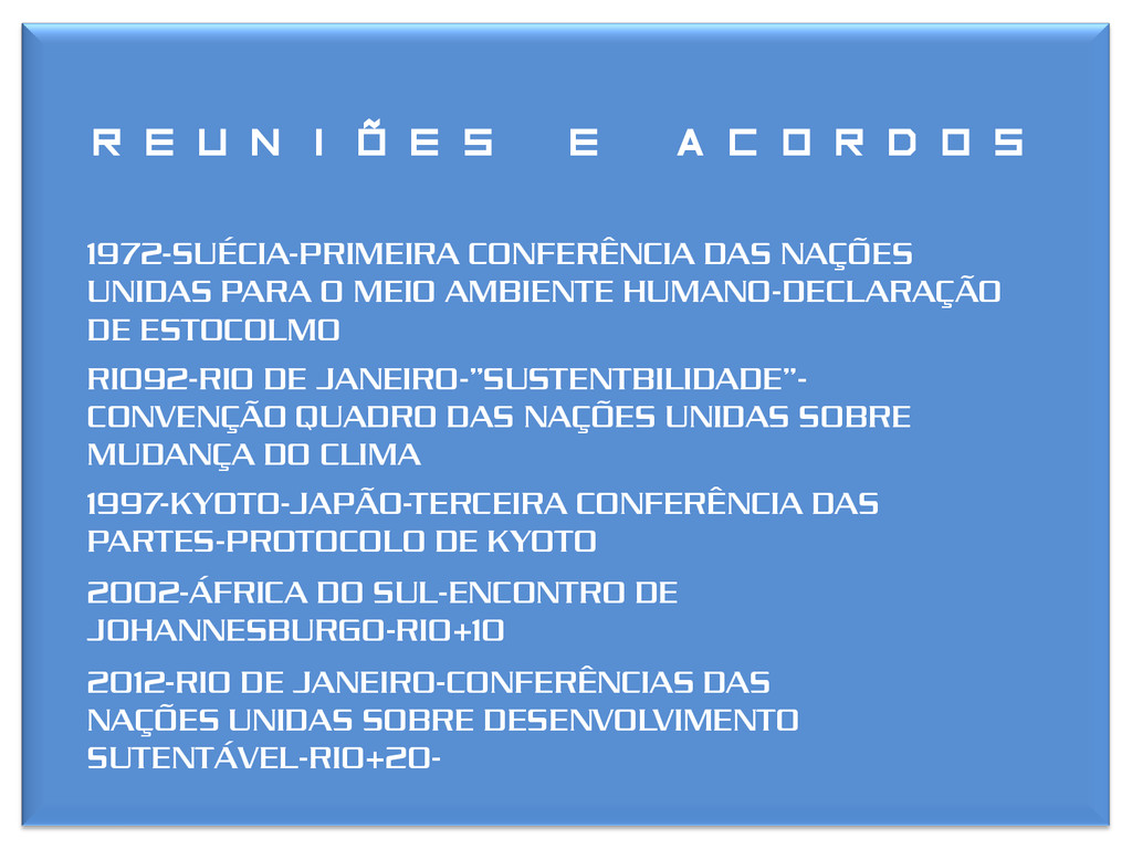 MEIO AMBIENTE HUMANO-DECLARAÇÃO DE ESTOCOLMO RIO92-RIO DE JANEIRO-”SUSTENTBILIDADE”- CONVENÇÃO QUADRO DAS NAÇÕES UNIDAS SOBRE MUDANÇA DO CLIMA 1997-KYOTO-JAPÃO-TERCEIRA CONFERÊNCIA DAS PARTES-PROTOCOLO DE KYOTO 2002-ÁFRICA DO SUL-ENCONTRO DE JOHANNESBURGO-RIO+10 2012-RIO DE JANEIRO-CONFERÊNCIAS DAS NAÇÕES UNIDAS SOBRE DESENVOLVIMENTO SUTENTÁVEL-RIO+20-