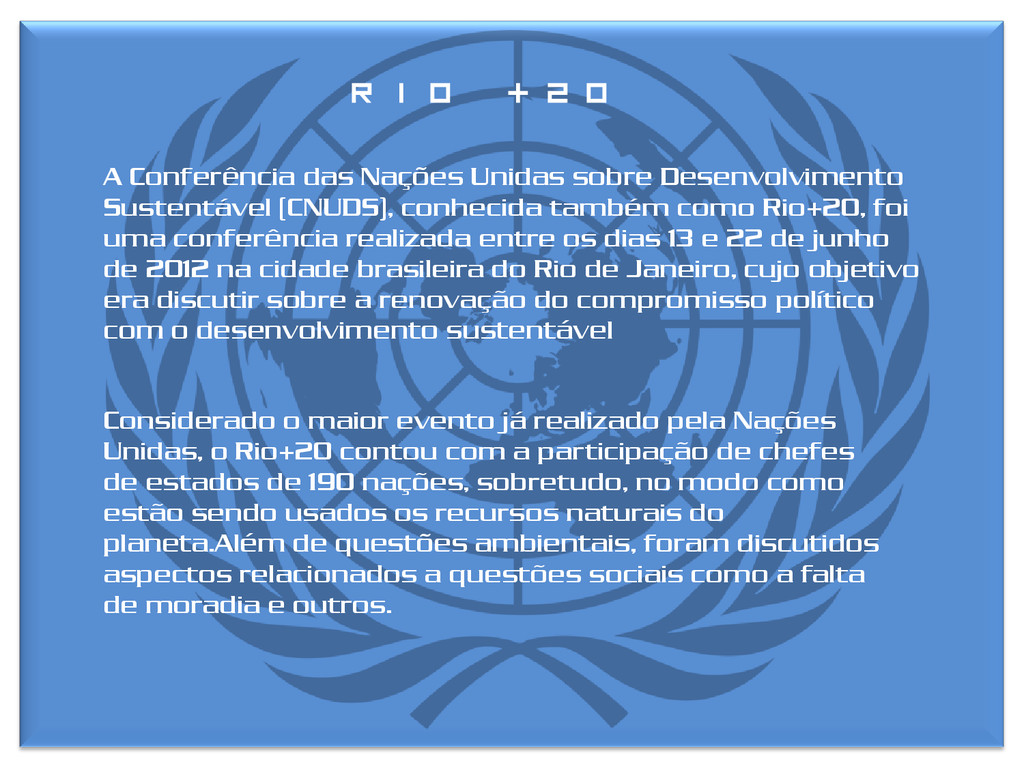(CNUDS), conhecida também como Rio+20, foi uma conferência realizada entre os dias 13 e 22 de junho de 2012 na cidade brasileira do Rio de Janeiro, cujo objetivo era discutir sobre a renovação do compromisso político com o desenvolvimento sustentável Considerado o maior evento já realizado pela Nações Unidas, o Rio+20 contou com a participação de chefes de estados de 190 nações, sobretudo, no modo como estão sendo usados os recursos naturais do planeta.Além de questões ambientais, foram discutidos aspectos relacionados a questões sociais como a falta de moradia e outros.