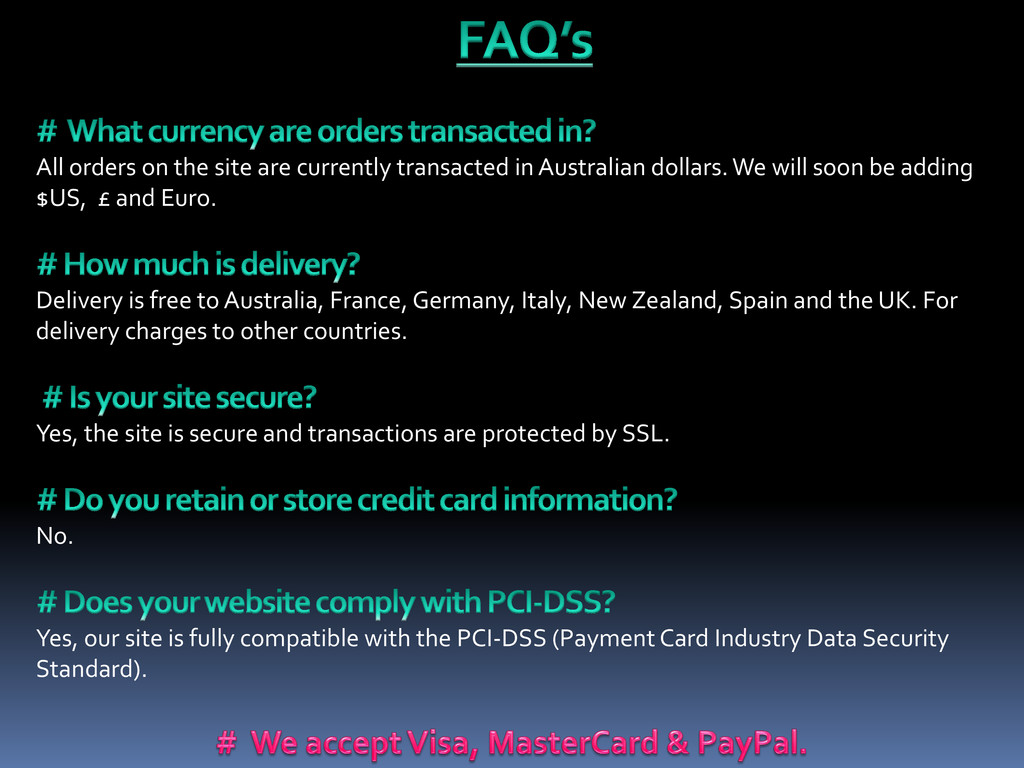 dollars. We will soon be adding $US, £ and Euro. Delivery is free to Australia, France, Germany, Italy, New Zealand, Spain and the UK. For delivery charges to other countries. Yes, the site is secure and transactions are protected by SSL. No. Yes, our site is fully compatible with the PCI-DSS (Payment Card Industry Data Security Standard).