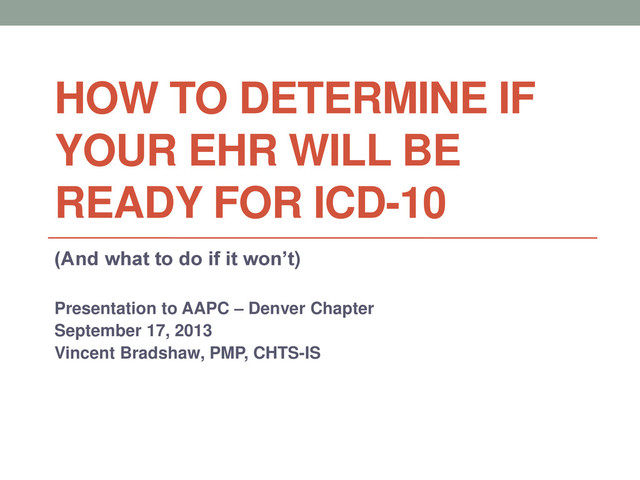 ICD-10 (And what to do if it won’t) Presentation to AAPC – Denver Chapter September 17, 2013 Vincent Bradshaw, PMP, CHTS-IS Disclaimer: This presentation is intended to provide accurate information as well as the presenter’s opinions and interpretations. The information was gathered from various government, commercial l and Internet sources. The topic of this presentation is dynamic and significant changes in the information may have taken place since the presentation was produced. The author has personal interests in consulting, presenting, writing about, and developing systems and software to assist medical providers and healthcare facilities .This presentation is for general educational purposes only and does not constitute business, professional or legal advice. Also, since each situation is different the presenter does not recommend any specific approach or course of action based solely on the information contained herein.