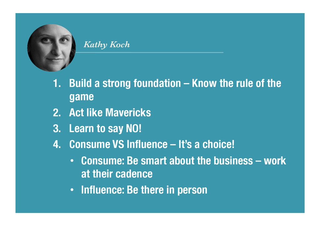 rule of the game 2. Act like Mavericks 3. Learn to say NO! 4. Consume VS Influence – It’s a choice! • Consume: Be smart about the business – work at their cadence • Influence: Be there in person