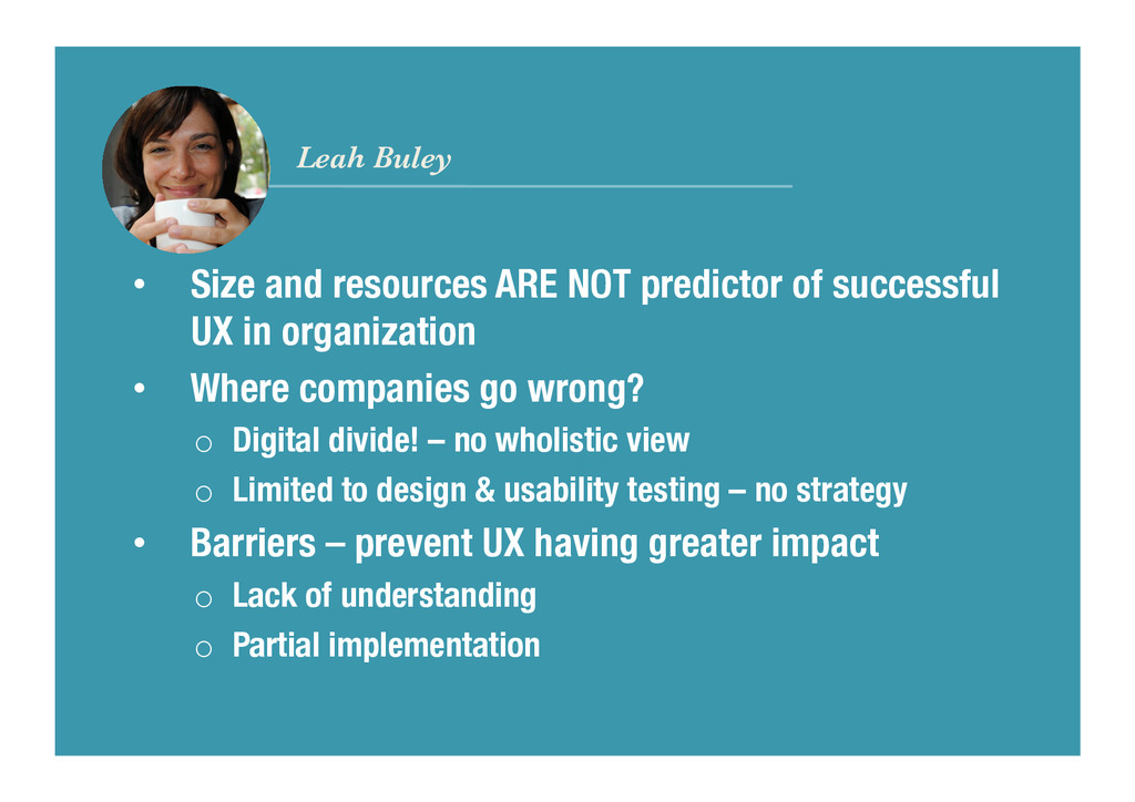 successful UX in organization • Where companies go wrong? o Digital divide! – no wholistic view o Limited to design & usability testing – no strategy • Barriers – prevent UX having greater impact o Lack of understanding o Partial implementation