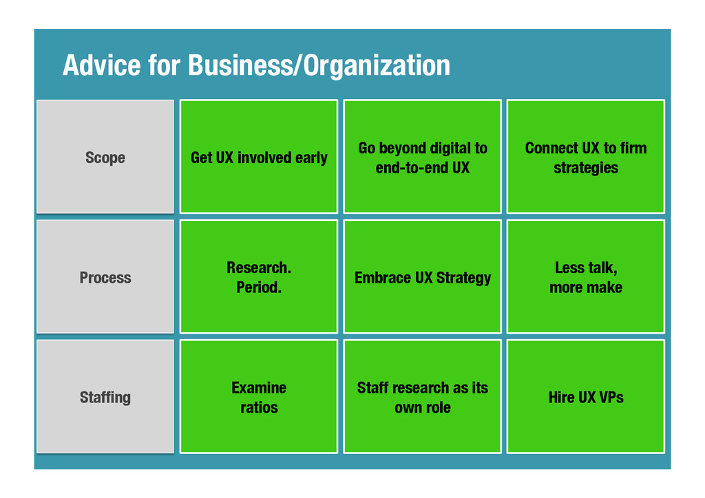 UX Connect UX to firm strategies Process Research. Period. Embrace UX Strategy Less talk, more make Staffing Examine " ratios Staff research as its own role Hire UX VPs Advice for Business/Organization