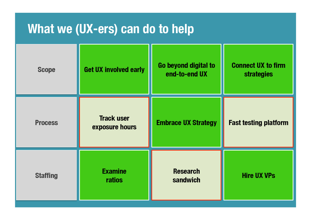 UX Connect UX to firm strategies Process Track user " exposure hours Embrace UX Strategy Fast testing platform Staffing Examine " ratios Research sandwich Hire UX VPs What we (UX-ers) can do to help