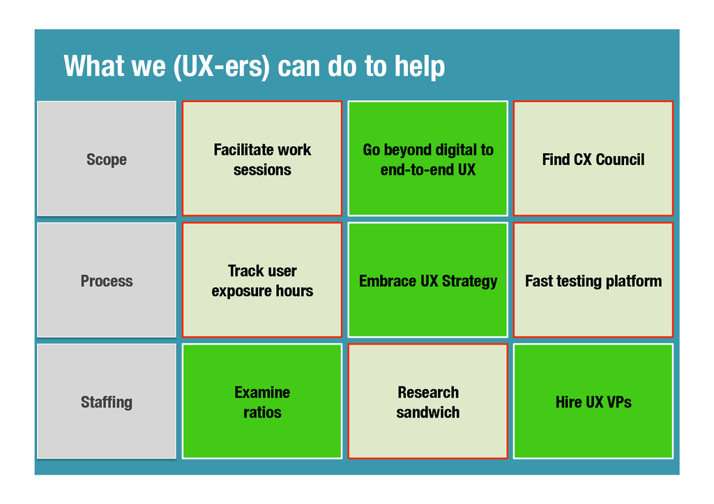 Find CX Council Process Track user " exposure hours Embrace UX Strategy Fast testing platform Staffing Examine " ratios Research sandwich Hire UX VPs What we (UX-ers) can do to help
