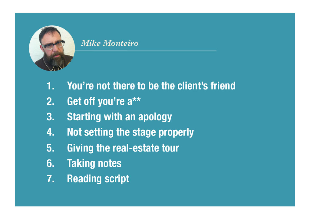 friend 2. Get off you’re a** 3. Starting with an apology 4. Not setting the stage properly 5. Giving the real-estate tour 6. Taking notes 7. Reading script