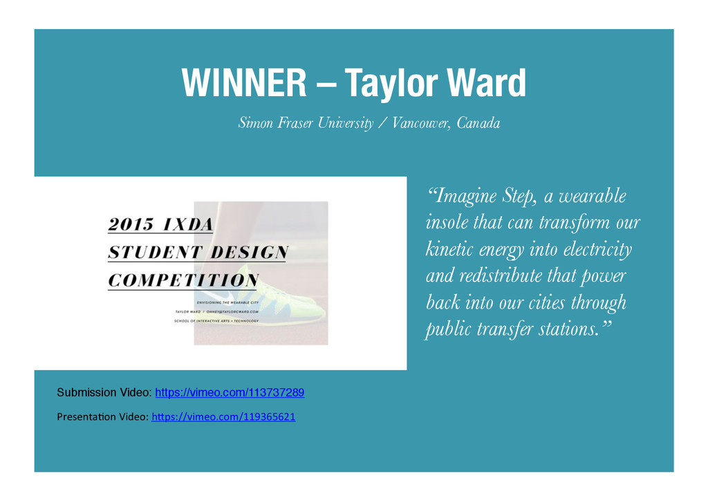 Canada Submission Video: https://vimeo.com/113737289" Presenta)on Video: h0ps://vimeo.com/119365621 “Imagine Step, a wearable insole that can transform our kinetic energy into electricity and redistribute that power back into our cities through public transfer stations.”