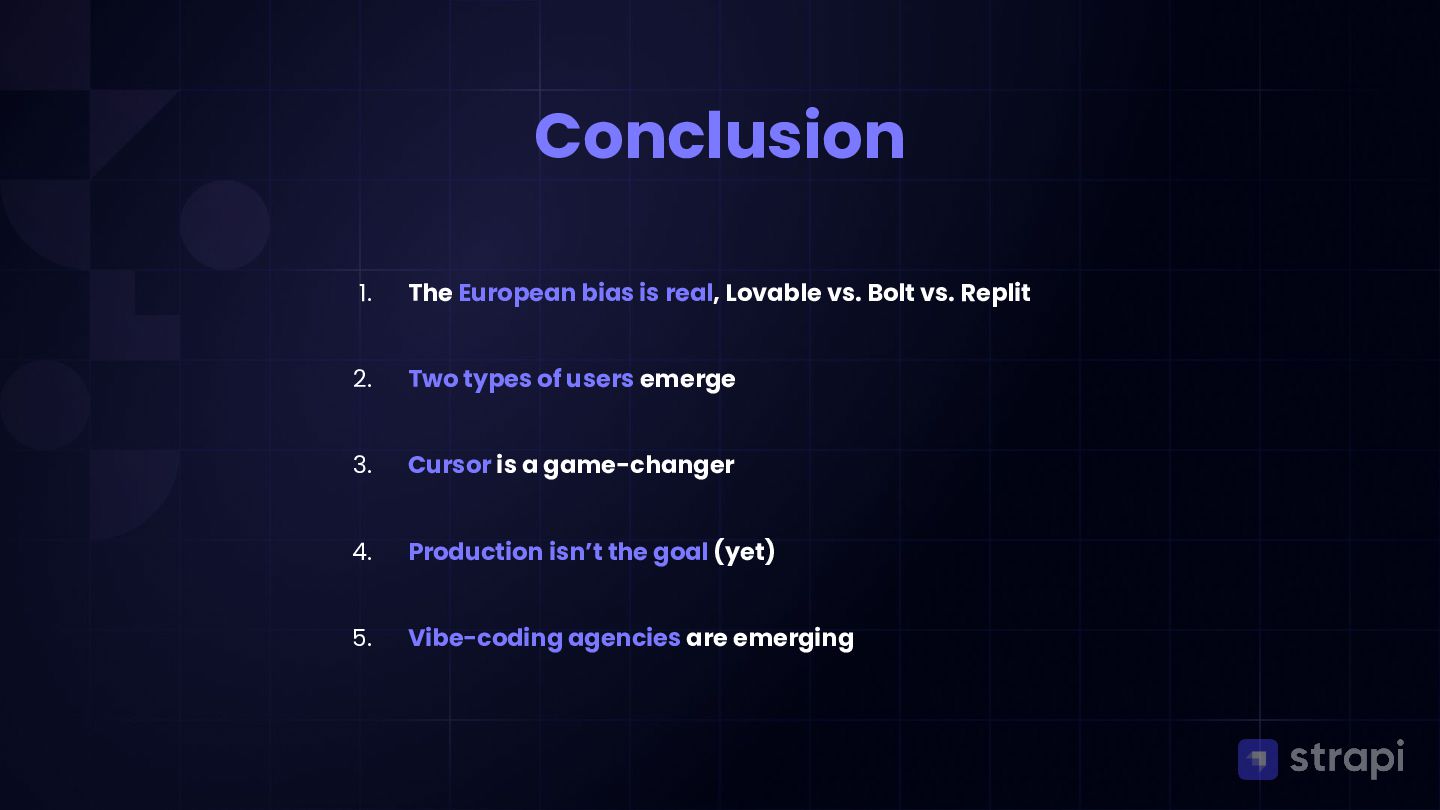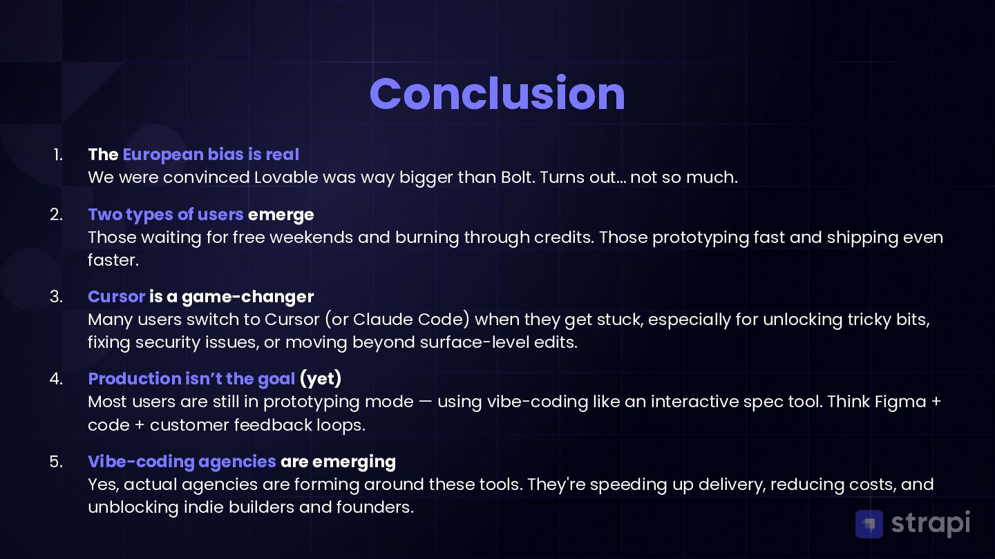 4. 🧪 Most users are still in **prototyping mode** — vibe coding as *“Figma for code.”*