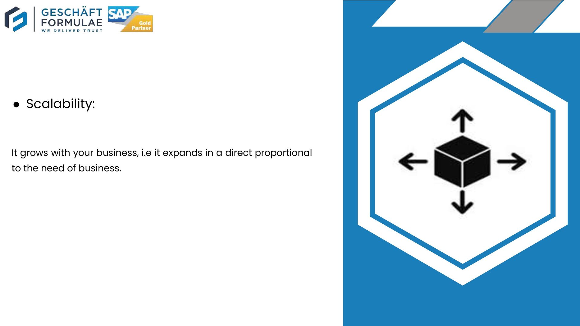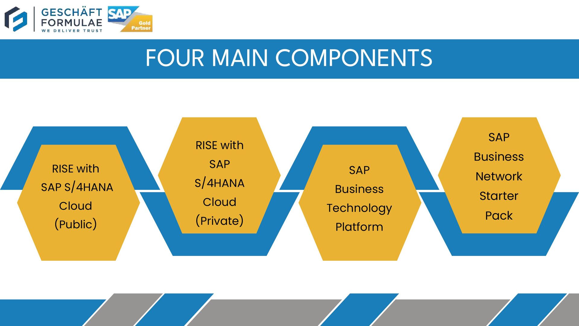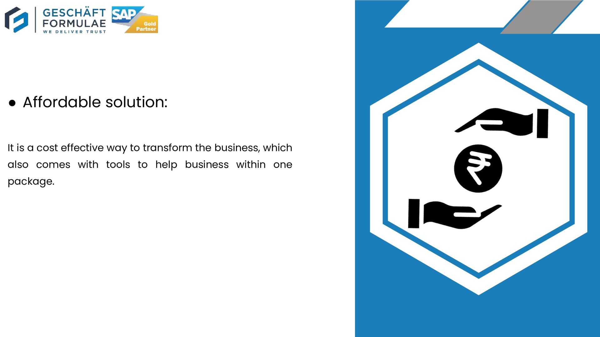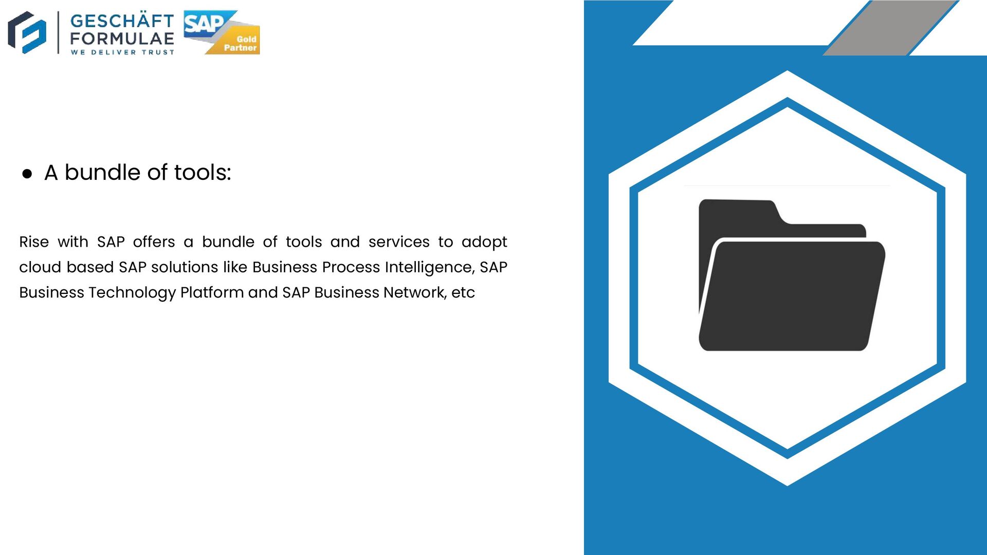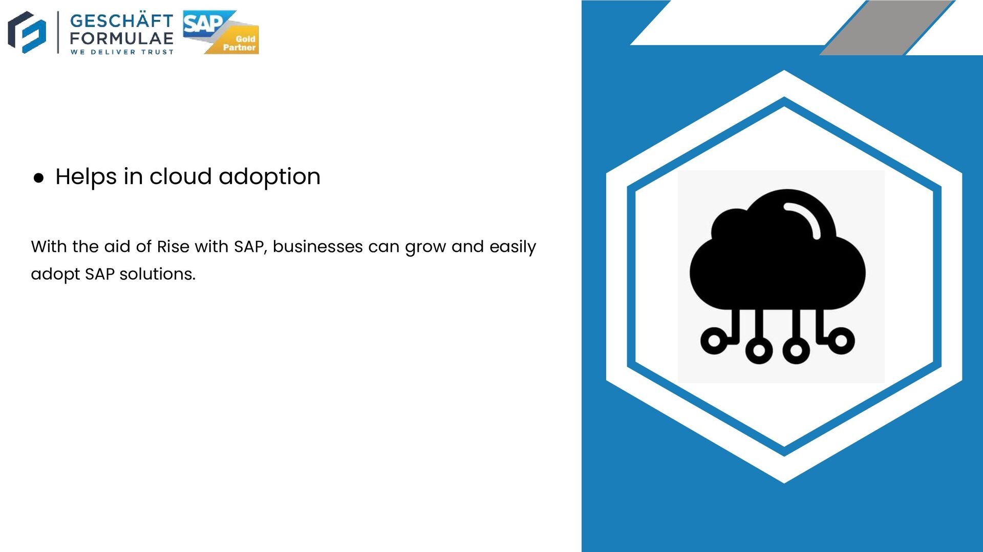 Rise with SAP partner Geschaft Formulae improves the transformation readiness of your business with cloud delivery capabilities. It helps in reducing risk by ensuring organizations have adequate support during the cloud based transformation journey.