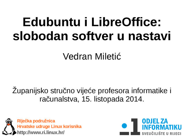 Na Županijskom stručnom vijeću profesora informatike i računalstva 15. listopada 2014. prezentiran je LibreOffice kao alternativa Microsoft Office alatima i Edubuntu kao operacijski sustav primarno namijenjen za škole. U okviru prezentacije Edubuntua navedena je i prikazana nekolicina alata koji mogu poslužiti kao zamjena za poznate alate za obradu rasterske i vektorske grafike te audio i video sadržaja. Više informacija: http://zsv-inf.skole.hr/