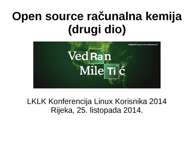 source alternativama – primarno GROMACS i CP2K • Migracija nastave kolegija na Linux – Kemoinformatika (lakše) – Dizajn biološki aktivnih molekula računalnim metodama (teže) • Uključivanje u razvoj softvera – Prvi commitovi već ušli u GROMACS i CP2K