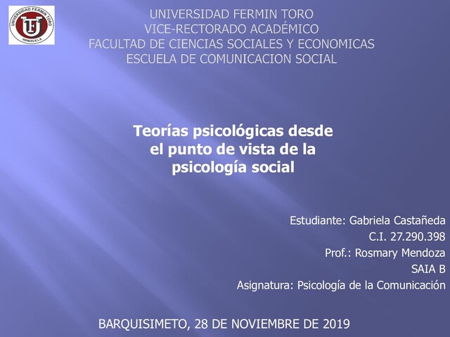 Asignatura: Psicología de la Comunicación BARQUISIMETO, 28 DE NOVIEMBRE DE 2019 Teorías psicológicas desde el punto de vista de la psicología social