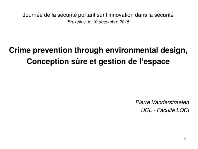 sécurité Bruxelles, le 10 décembre 2015 Crime prevention through environmental design, Conception sûre et gestion de l’espace Pierre Vanderstraeten UCL - Faculté LOCI